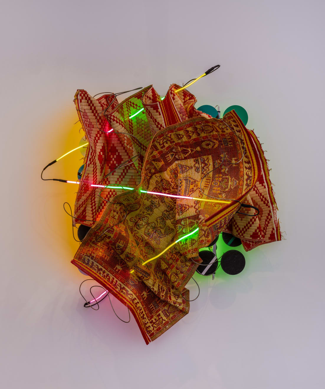 Judy Pfaff : Hm… yes, in a way. Neon is a strange kind of energy—different from LEDs or incandescent light. I think of it as painterly: it reflects color, creates ambient energy, and brings cheerfulness. Using neon unsupported makes it fragile, playful, almost alive. My background in painting always informs how I use color and light together.