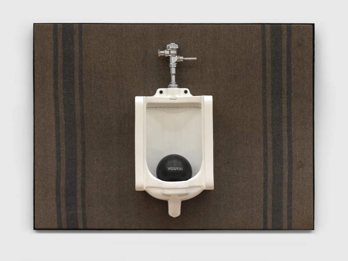 Heritage-xii: Nick Hoecker. Heritage XII, 2025. German Wool Blanket, American Standard Urinal, Weapon Bowling Ball, Hardware, Steel Artist Frame. 50" H x 68" W x 1.5" D