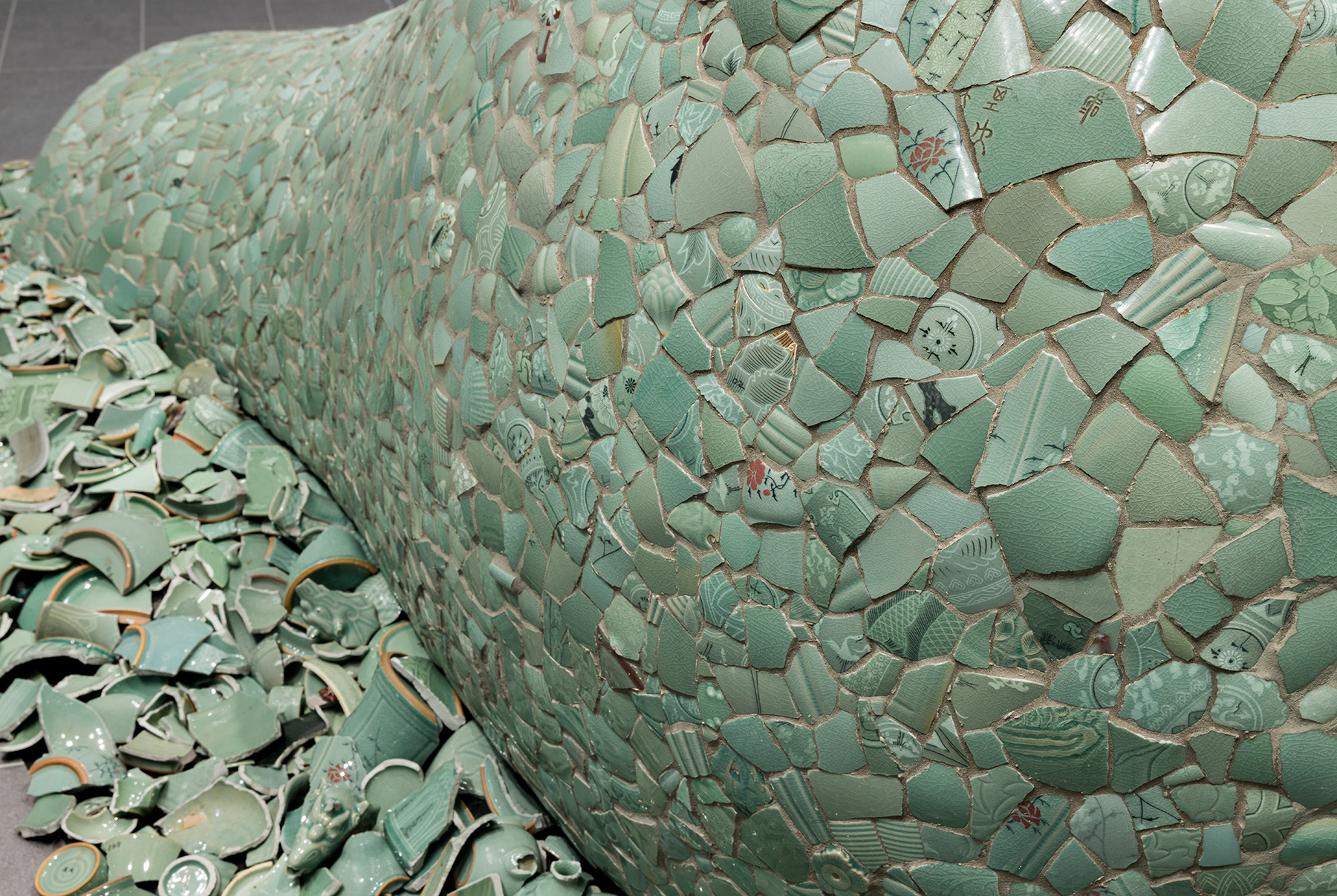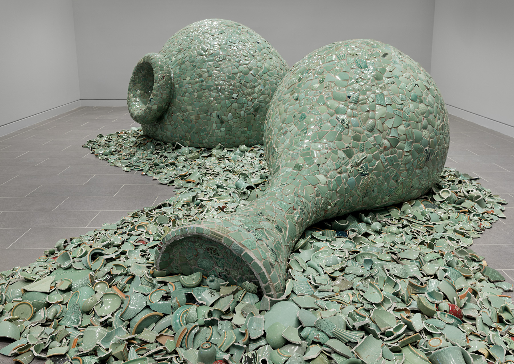 Presented in parallel at the Green-Wood greenhouse, Celadon Landscape (2015/ 2026) extends this inquiry into another register. If Offering engages the cycle of life and death, Celadon Landscape turns toward the afterlives of cultural memory. Composed of thousands of discarded celadon shards collected from ceramic kilns in Icheon, Korea, the installation occupies space as though two vessels had been overturned and spilled into the room. What once stood vertically as a unified form now unfolds horizontally into a fragmented terrain. Yet each shard retains the luminous surface of celadon, carrying traces of artisanal labor, historical continuity, and cultural lineage. For Shin, these fragments become a metaphor for diasporic existence—displaced from their original context yet still bearing the imprint of origin.