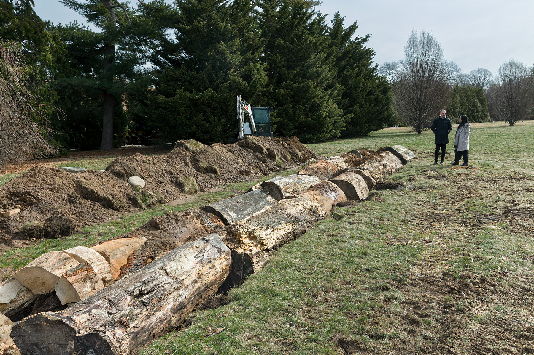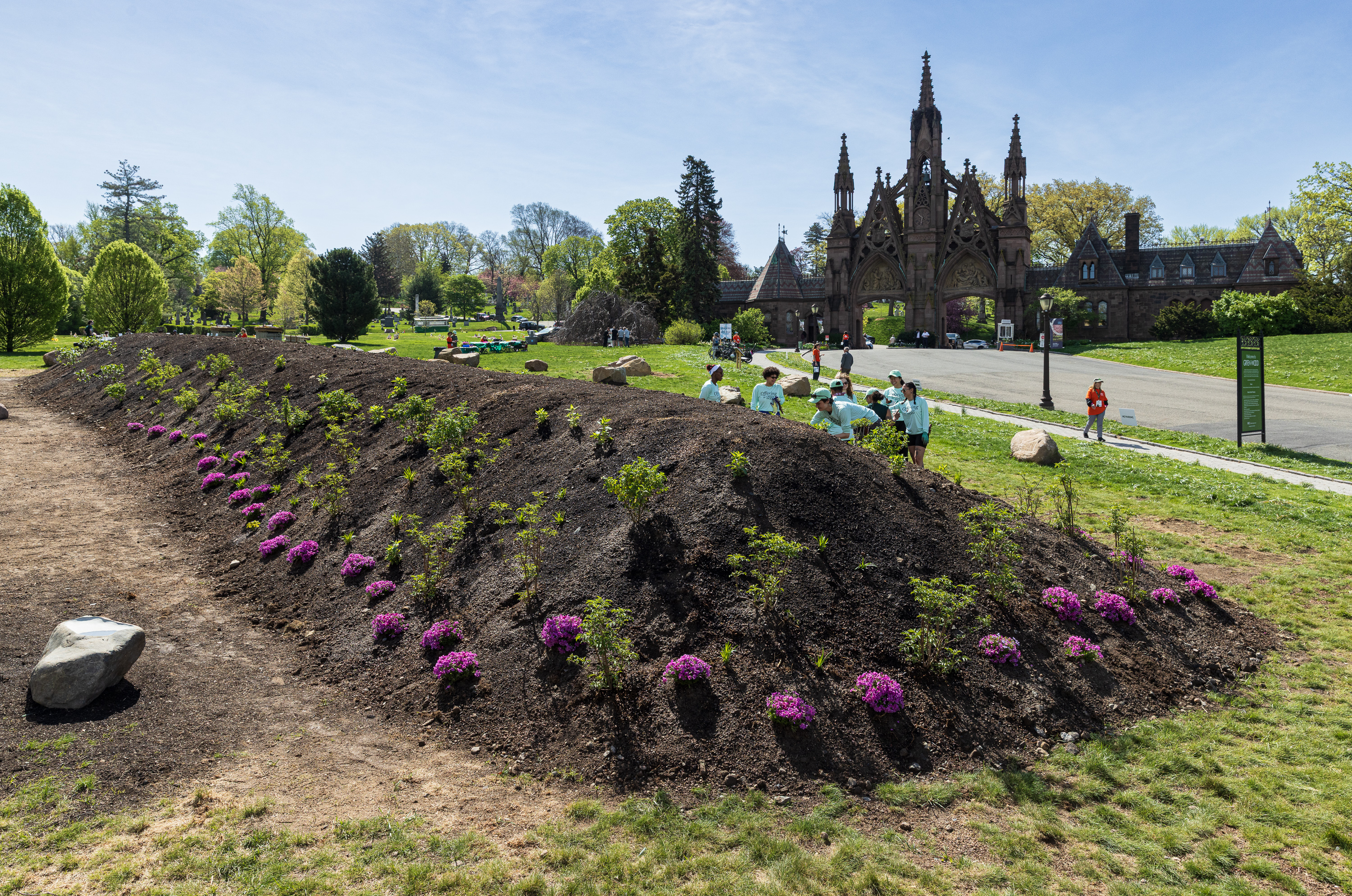 Within this setting, Offering (2026), a large-scale regenerative earthwork by Jean Shin, opened on April 18 at the main entrance of Green-Wood Cemetery. At the center of the project is the ceremonial burial of two fallen trees—a red oak and a pin oak that had lived out their lives within the cemetery grounds. Rather than treating them as debris to be cleared, Shin honors these trees as “tree elders,” extending to them the same dignity accorded to those interred in the cemetery. Through the construction of earthen mounds, Shin establishes a dedicated burial site for the nonhuman life that defines the cemetery’s history.