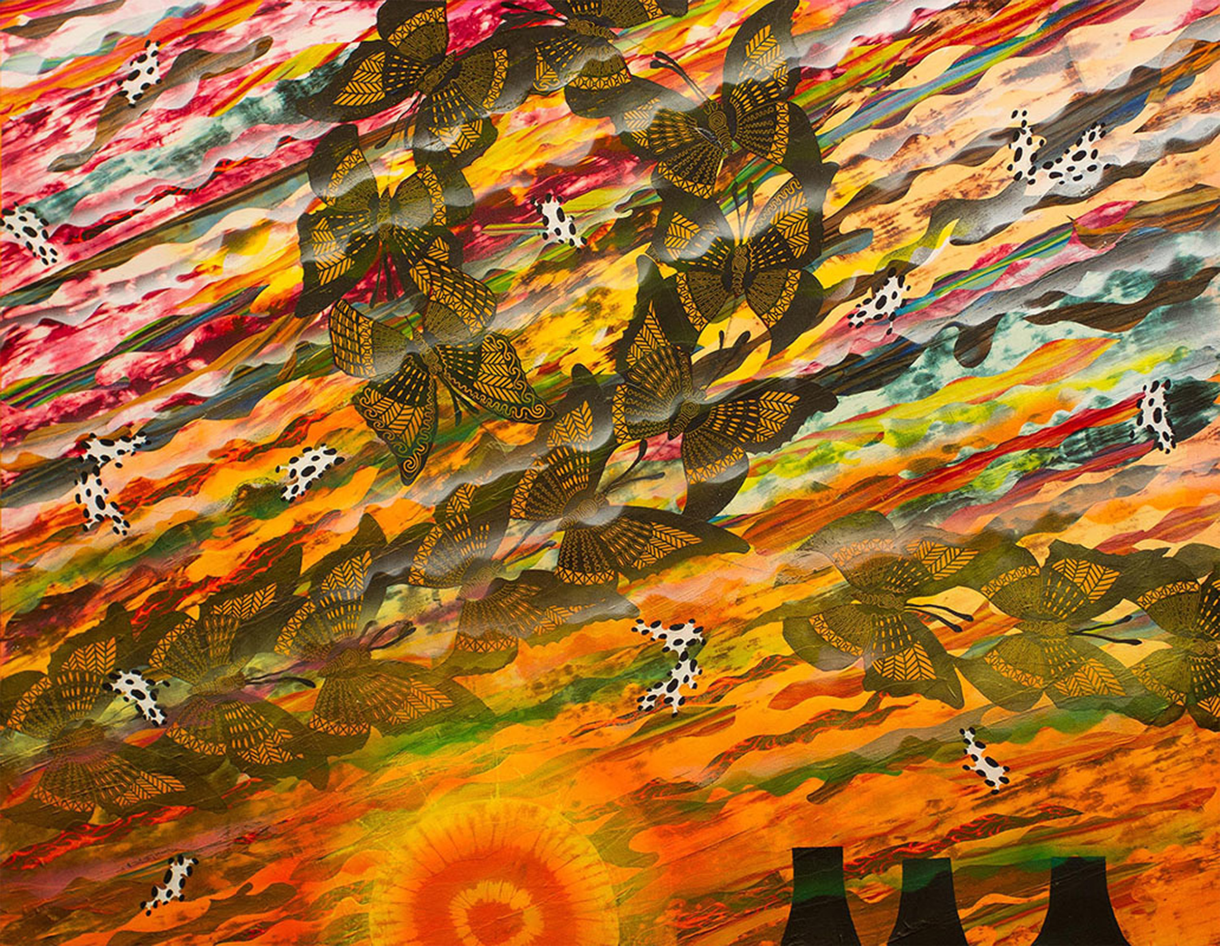 Emerging out of the darkness are glimmers of light -- and perhaps even of hope. Los Alamos Sunset (2014, Fabric collage; acrylic and spray paint on canvas, 62.5 x 79.5 inches) is characterized by a diagonal rush of energy and color raging across the surface from the bottom left to the upper right corner of the canvas. Vibrant cadmium yellows, oranges and reds emit a blaze. Rays of red and orange encircle the seemingly tie-dyed setting sun in the center foreground. Elaborate butterflies excised from fabric are integrated into the stunning glow of sky. Perhaps our ultimate doom could occur with such a sunset, resplendent in a glorious blaze of radiant light. If the work were meant to represent sunrise, it might have been more hopeful.