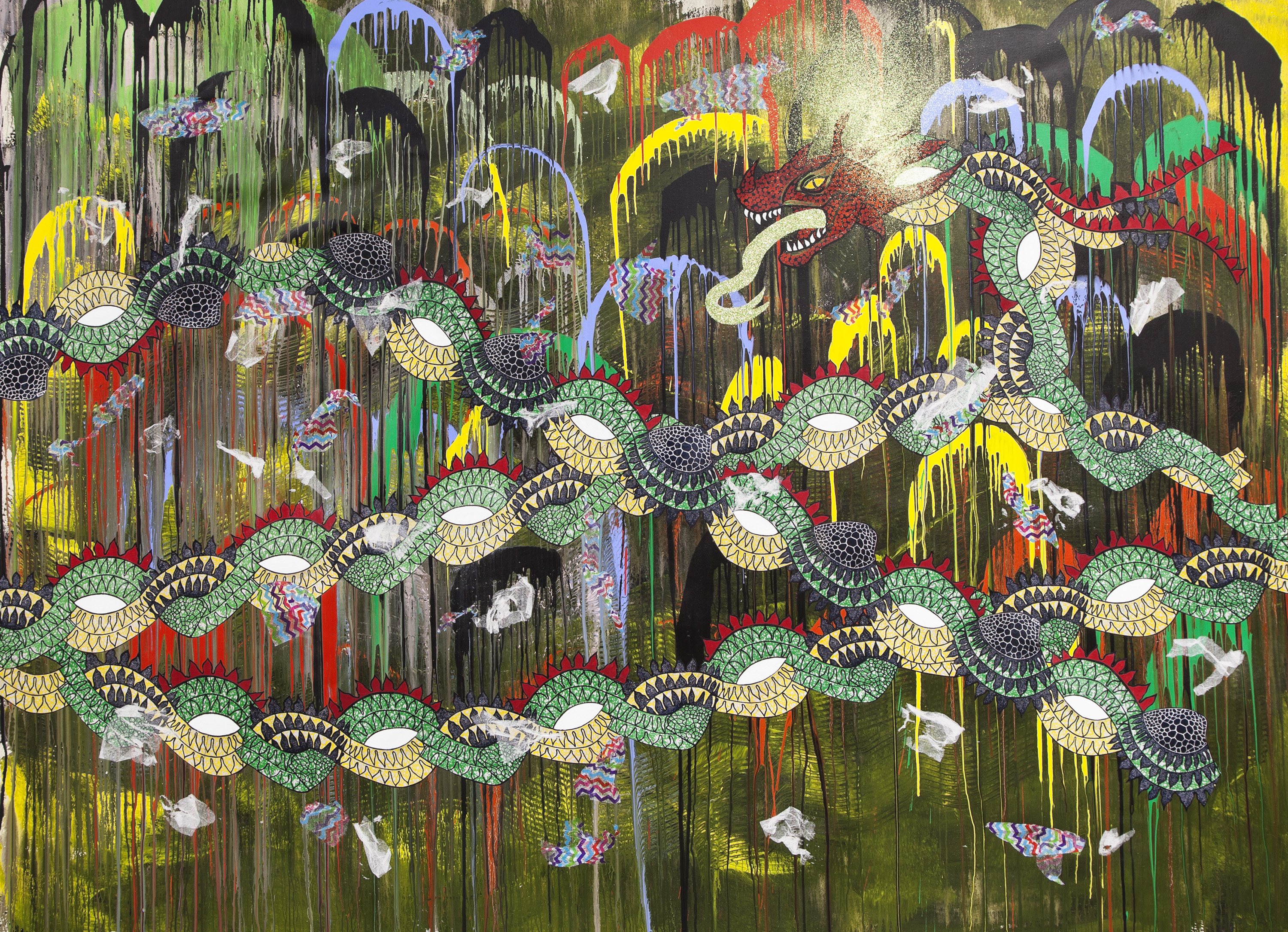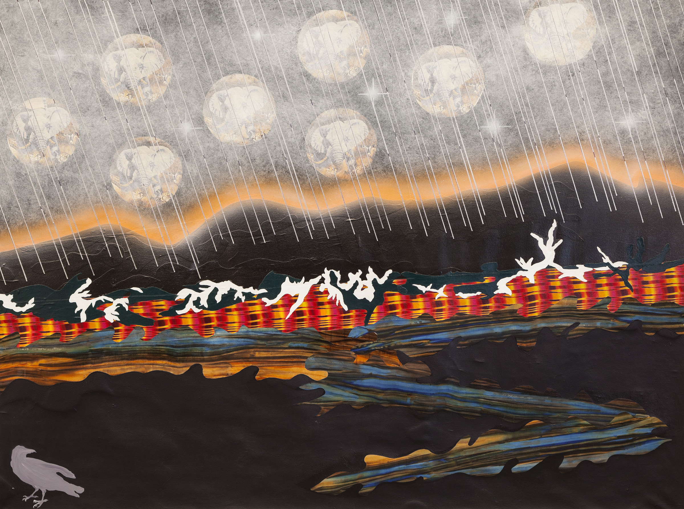 The dystopian theme stems from the artist’s concern with the fragility of life and the calamity wrought by man’s intervention into our delicate and dwindling earthly paradise. As such, death is embroidered as a persistent thread in this series. The striking harmony of Memento Mori, (2014, Fabric collage; acrylic and spray paint on fabric, 64 x 84 inches) still cannot help but remind us we must die. This vast wide scale vista is permeated with darkness and an aura of foreboding. A horizon of dark rolling hills in the middle ground ebbs into a foreground that implies waves of black water. The silhouette of a crow reinforces the implication of death. In the background, elephant faces in celestial bubbles are collaged on the surface of a mottled gray sky with a texture resembling rice paper.