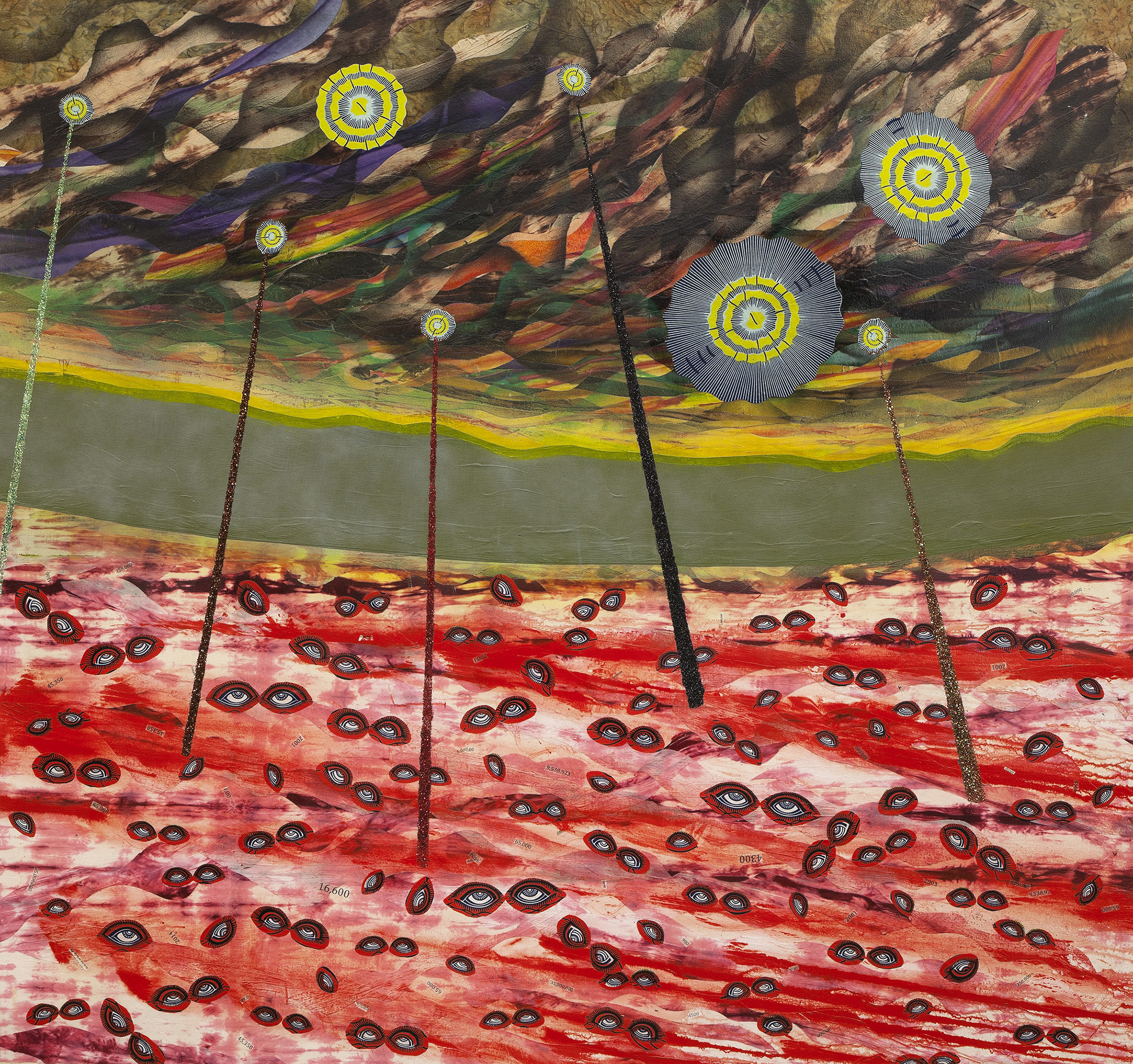 Estes repurposes cloth -- most notably batik and printed fabric from Asia and Africa -- sourced online and from shops in downtown Los Angeles and Chinatown. The fabrics feature recurring motifs -- dragons, elephants, butterflies, flowers, fish, birds, eyes -- which Estes cuts out and introduces into her compositions in repeated patterns, imbuing the representative symbols with new contextual significance. Borrowing from textile production, long considered a feminine art, the artist’s work is a contemporary heir of the Pattern and Decoration Movement of the 1970s. She seamlessly combines ornamental elements with new material -- often found -- in a harmonious synthesis of abstraction and decoration combined with representational allusions. Found motifs and primary elements are interwoven in a balanced synthesis. In Fire Power, (2014, Fabric collage; acrylic and glitter on fabric, 64 x 69 inches), the artist has collaged bands of fabric in layers, upon which she has applied paint. The borrowed design motifs of eyes and flowers have been cut from fabric and superimposed into the composition. Dramatic flowers on elongated stems loom out of the background like an alien plant species. The foreground landscape is populated by watching eyes -- suggesting omnipresent silent witnesses of an earthly sentient consciousness.