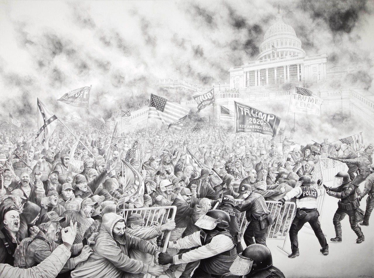 Her mature style developed as a third chapter when she returned to L.A in 2012 and embarked on a more ambitious project of chronicling our times - which has earned Lipton high praise as “a modern day Goya”. Her phantasmagorical graphite paintings are horror stories about mankind abundant with Lipton’s signature motifs: tangled electrical cords, jumbled robotic contraptions, uncanny creatures that are part human and part machine. She explores technology’s role in disseminating disinformation and controlling people who are isolated in front of screens, scrolling through social media. Lipton’s imagery has a retro-futuristic quality often incorporating startling depictions of her own face with a bald head, like a mannequin. In Post Truth a depiction of Trump as a mechanical talking head with a large mouthpiece that is wrenched open wide, is surrounded by microphones in an industrial hell-scape with no spectators, only smiley and thumbs up emojis. America! America! is an epic depiction of the January 6th insurrection with an angry, riotous crowd brandishing flags and weapons, pushing down fences and the police officers who try to restrain them. The harrowing scene is filled with billows of gray smoke. Lipton is also adept at using light to evoke strong emotion and create atmospheric perspective.