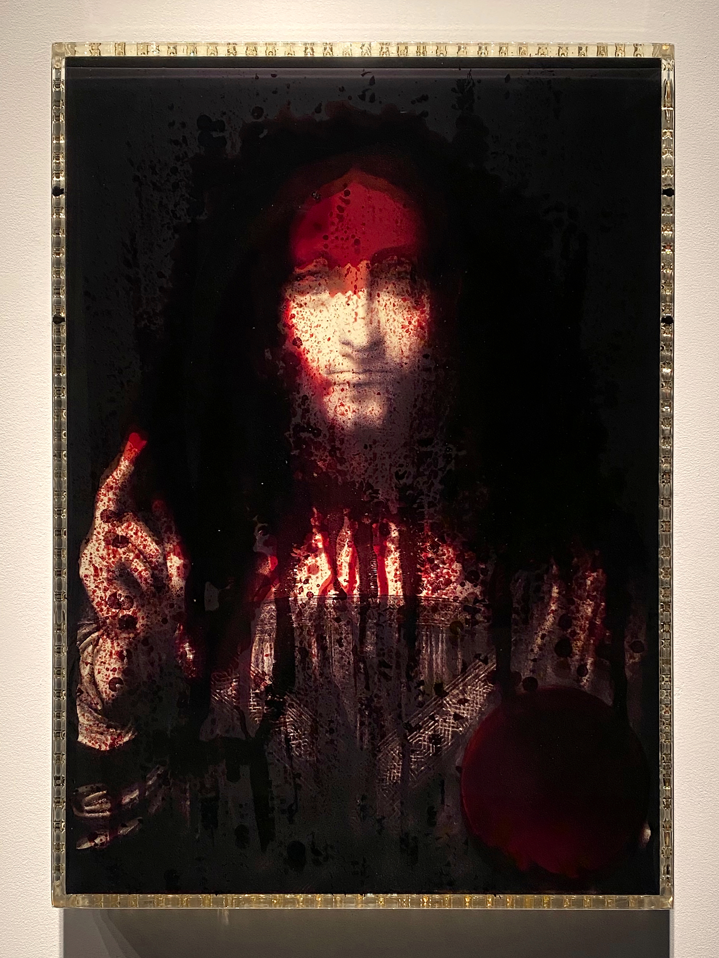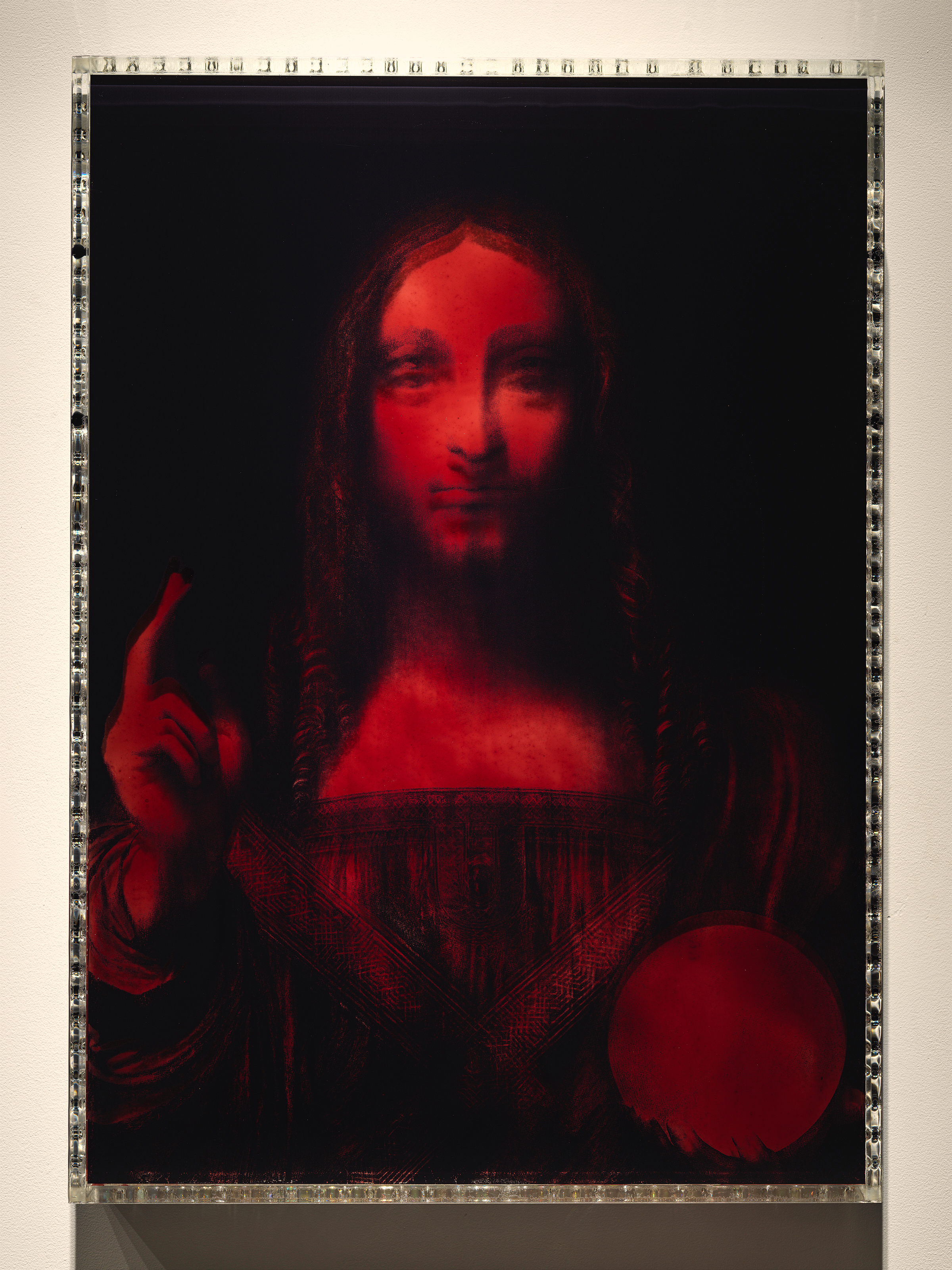 Jordan Eagles (born 1977; born New York, NY), Vinci, 2018. Grayscale image of Salvator Mundi, and blood of an undetectable HIV+ long-term survivor and activist in UV resin and plexiglass; 67.9 × 48.3 × 7.6 cm. Collection of Donald Capoccia © Jordan Eagles