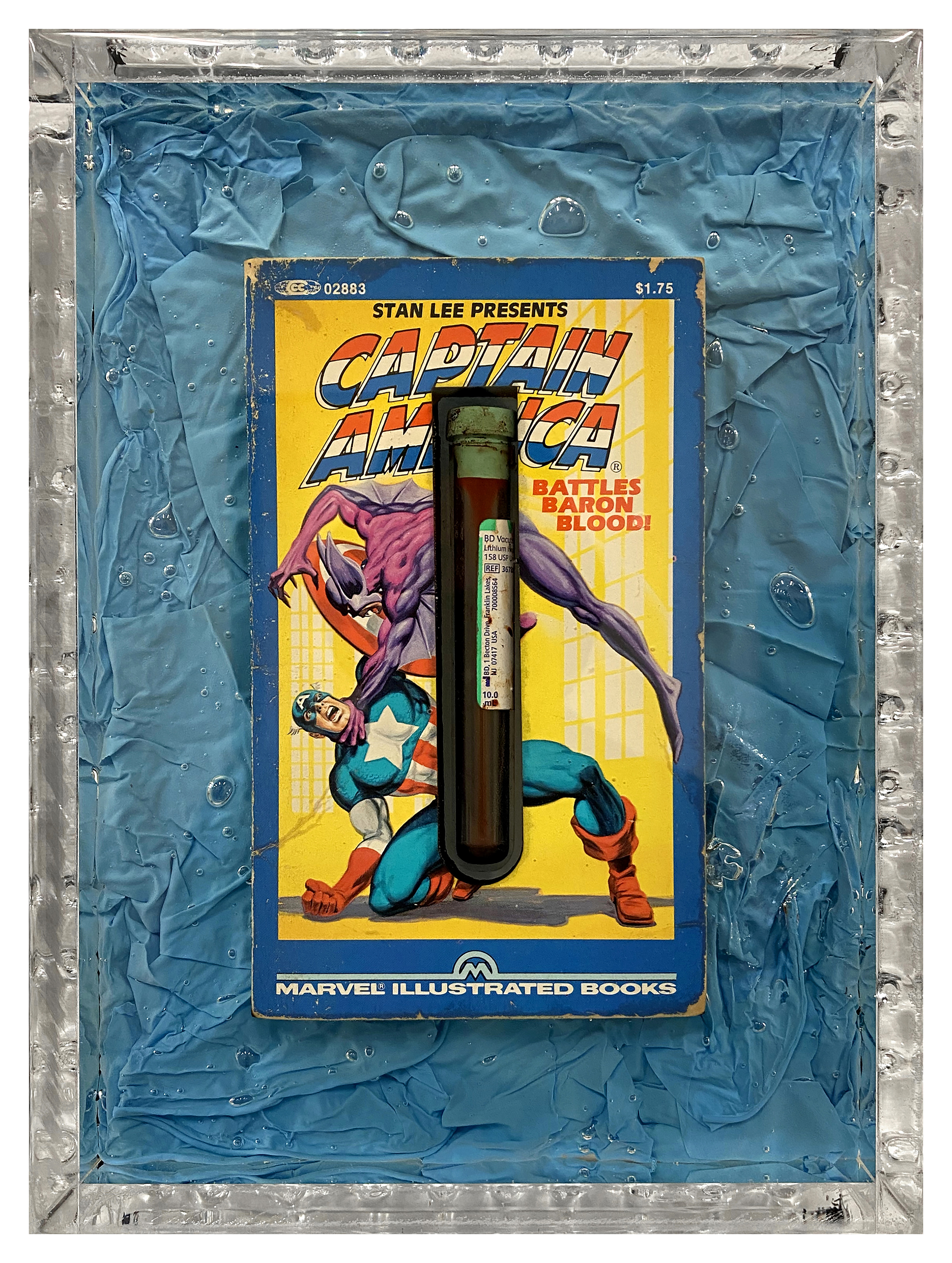 Jordan Eagles (born 1977; born New York, NY), Queer Blood America, 2021. Original 1982 Captain America, blood of a queer man, collection tube, and blue nitrile gloves in UV resin and plexiglass; 27.3 × 20.3 × 7 cm. Courtesy of the artist and New Discretions, New York © Jordan Eagles