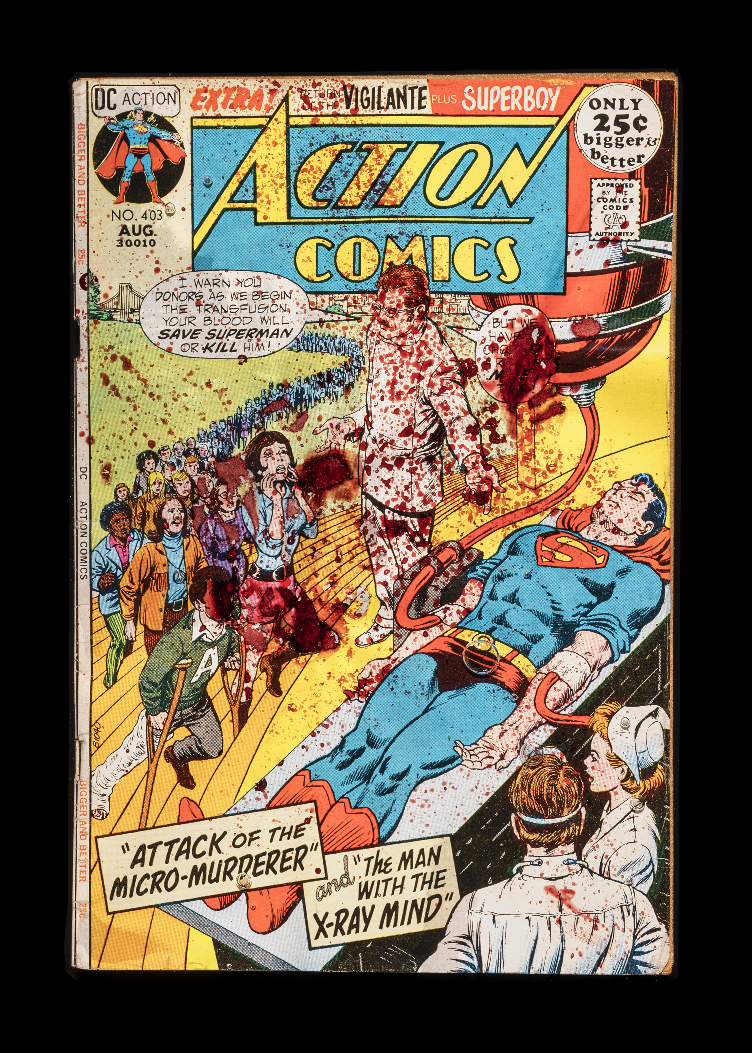 In some instances, it is a gay man on PrEP, very straightforward. It is really about the medical side of what is happening in the blood and how it connects to the source material. With this body of work, I was attempting to create more entry points into policy conversations by pairing iconic imagery with the blood of the donor. Superman, for example, is someone most people already have a reference point for and feel something toward. Seeing him lying lifeless on a gurney with needles in his arms, needing a massive blood transfusion from the people of Metropolis, and pairing that image with the blood of a gay man on PrEP who should be able to donate blood but cannot, carries a clear message and traces a bit of history.