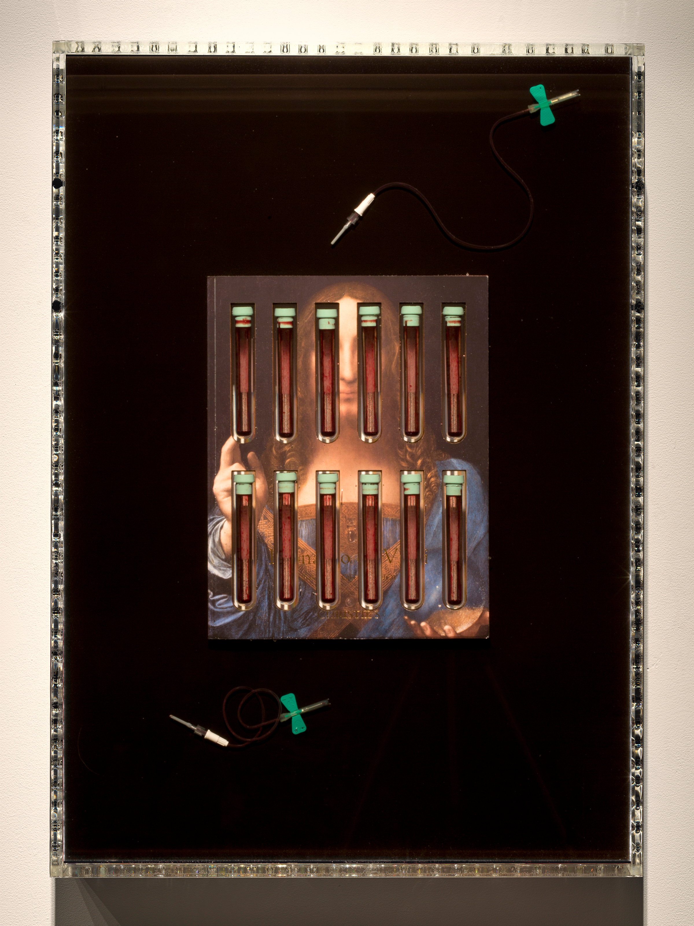 Jordan Eagles (born 1977; born New York, NY), Jesus, Christie's, 2018. Christie's sale catalogue, medical tubes, needles, and blood of an undetectable HIV+ long-term survivor and activist in UV resin and plexiglass; 67.9 × 48.3 × 7.6 cm. Courtesy of the artist and New Discretions, New York © Jordan Eagles