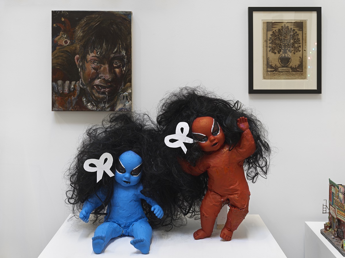 Kembra Pfahler, Blue and Red Dolls, 2025 Plastic doll, papier mâché, tempera, artificial hair, silk bows, face paint with oil based paint and glitter