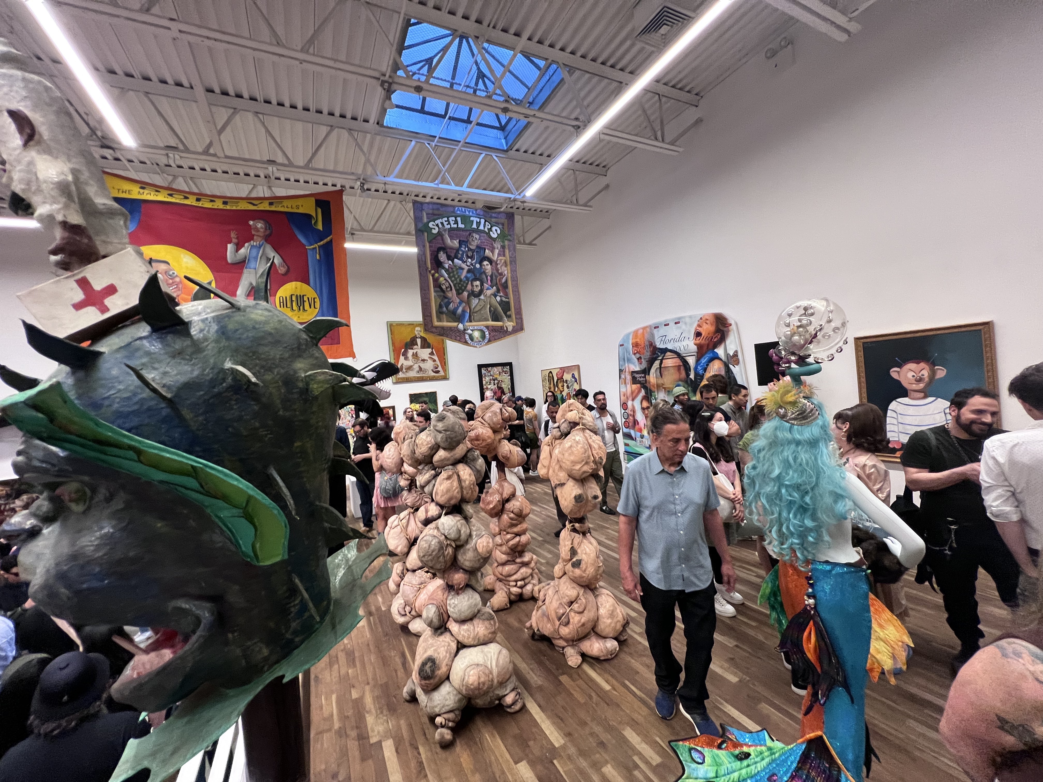 Such are the parameters of Carnival: Dark grotesquerie, often charged with dark humor. How had the show been born, I wondered? Coleman said that soon after a fat book of his work had come out he had been talking with Jeffrey Deitch in his Los Angeles home. “And he came up with the idea of doing this carnival show with me,” Coleman said. “He knew my knowledge of the subject. I told him I didn’t want to do a normal curatorial thing of just contemporary artists but I wanted to use people that were active in the carnival culture, whether it was burlesque or sideshow or mardi gras or even puppet shows. And contemporary art inspired by the carnival.”