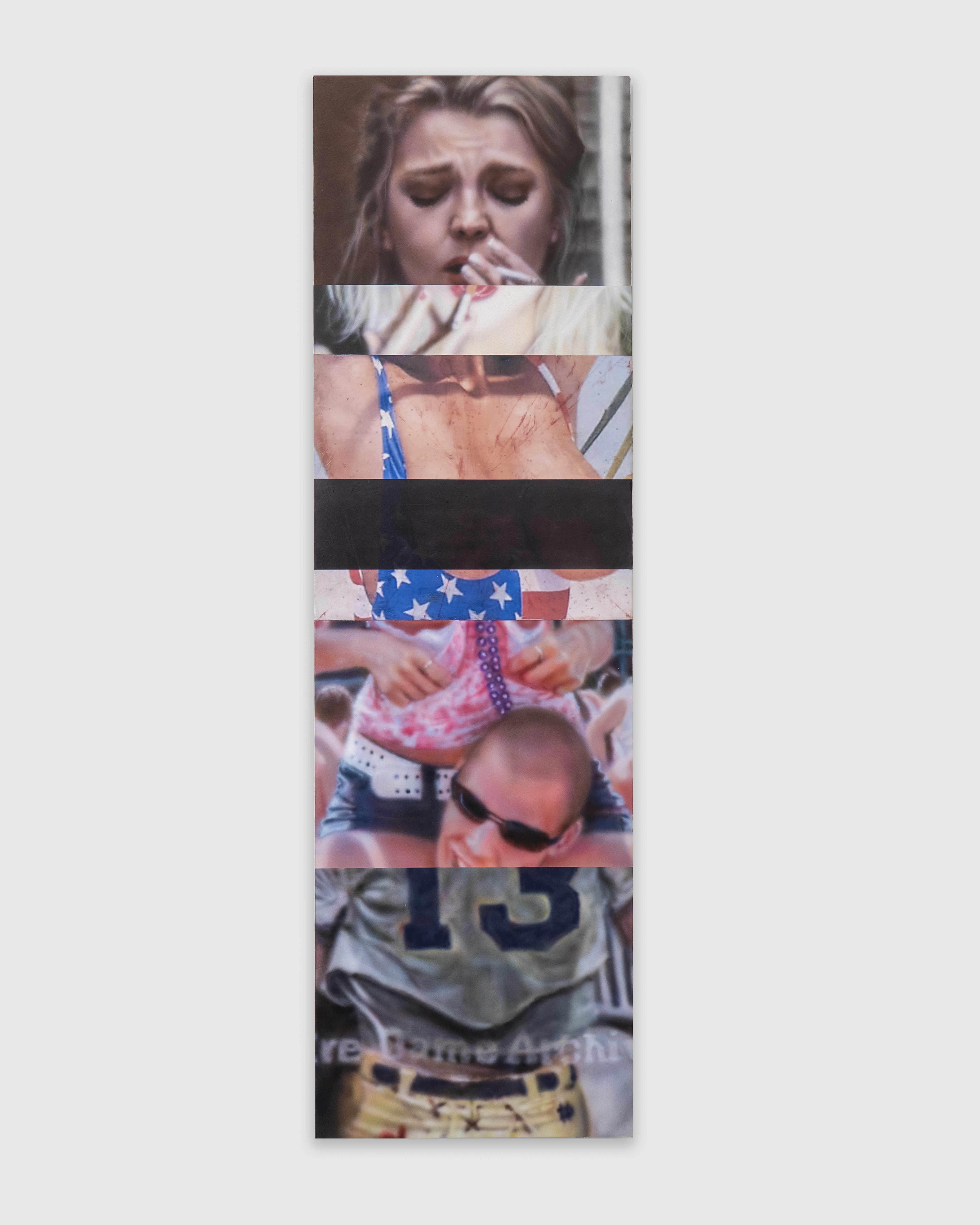 True men, like you men, 2025. Acrylic, pigment transfer, thermochromic ink, gouache, iridescent ink and glitter on linen 60 x 18 in. Courtesy of the Artist and GRIMM, Amsterdam | London | New York. Photo credit: Mikey Mosher