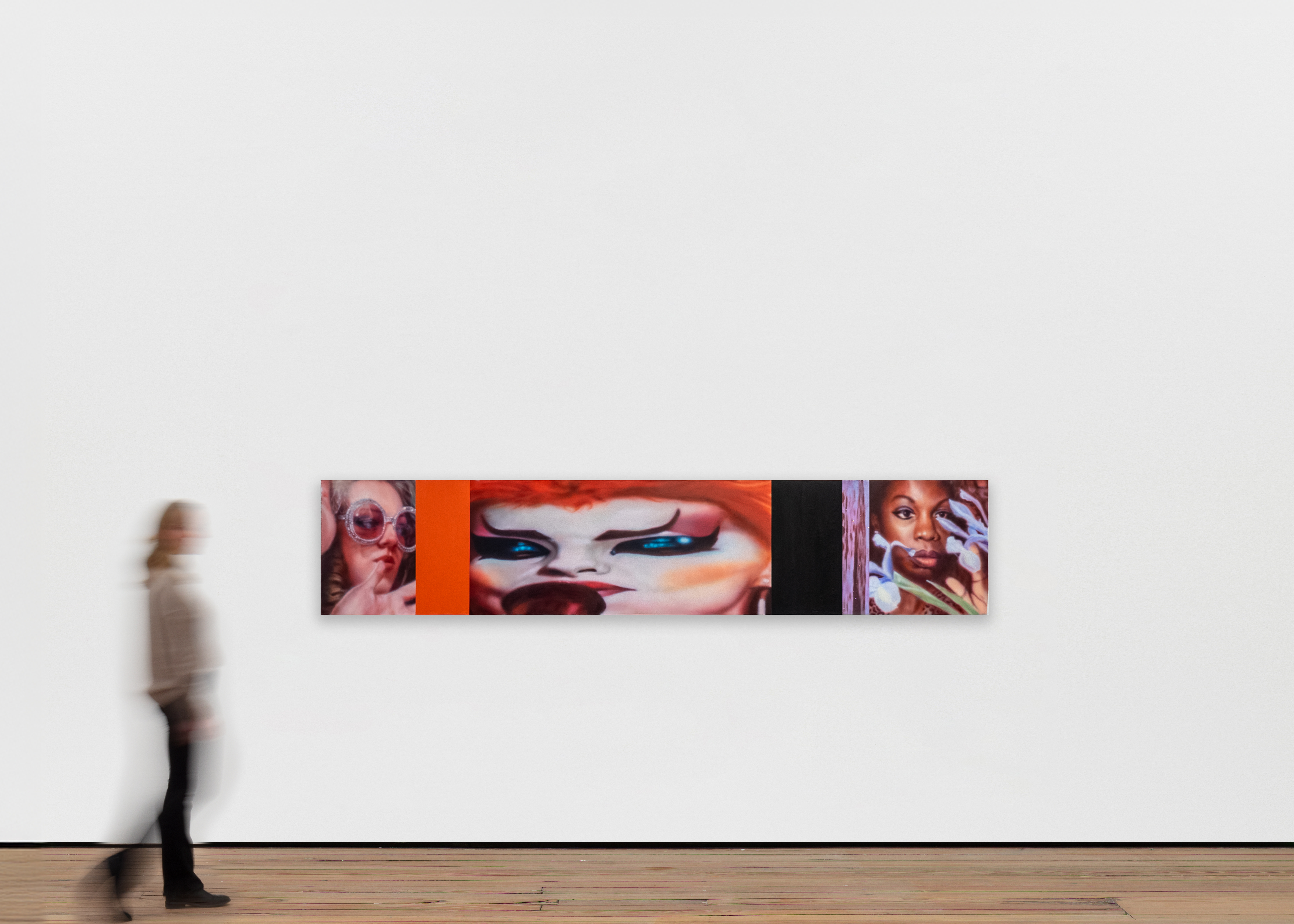 Liza Jo Eilers: This time around I’m diving more into fragmentation by splitting, doubling or obscuring, to show how visibility itself can be slippery, even manipulative. For this show, in particular, I’ve used long narrow horizontal and vertical canvases, which kind of suggests a film strip, creating interruption but also continuation. The idea that what you’re seeing many clipped moments from a longer performance. The image no longer arrives as something whole, but as something unstable, conditional, always changing. That shift makes the “performance” not only about theatrics but also about structure itself: the way an image appears, vanishes, and reconstitutes itself for whoever is watching. This instability feels true to our moment. What’s promised, withheld? What glimmers for an instant before vanishing, and what insists to last forever…if forever even exists.