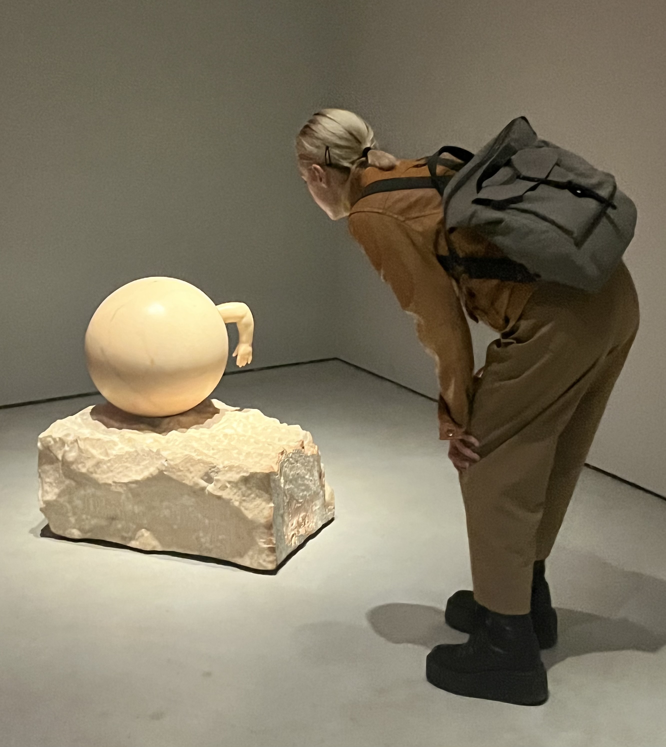 A woman examines Untitled (With Hand), 1989, pink marble, by Louise Bourgeois. Photo by Lisa Freeman