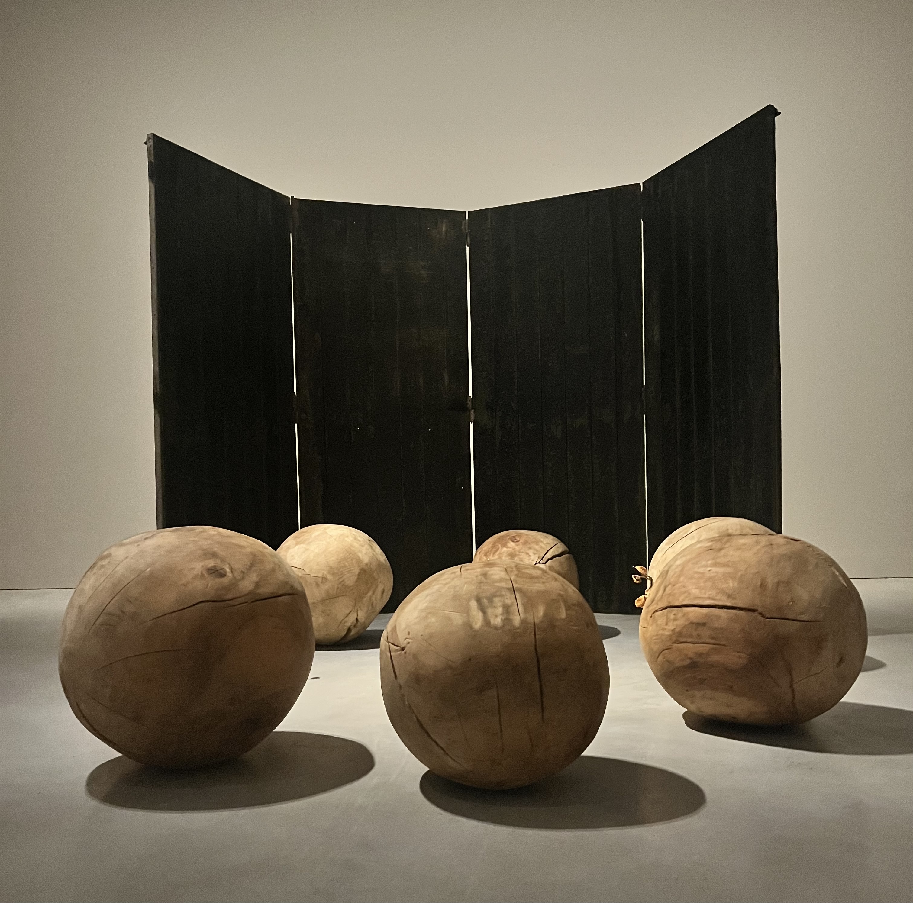 When Louise Bourgeois created Gathering Wool in 1990, she gave physical form to rumination itself—the mental drift between consciousness and dream, that space where thoughts fragment and reform without permission. The installation is the centerpiece of the exhibition Louise Bourgeois: Gathering Wool, which opened Nov. 6 at Hauser & Wirth's 22nd Street location. It consists of seven wooden spheres positioned before a tall four-panel screen, with small mushrooms emerging from the wood's fissures.
