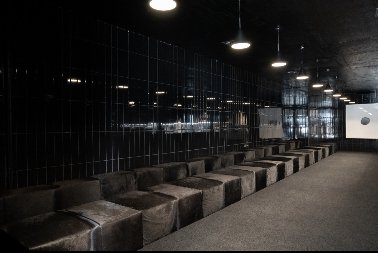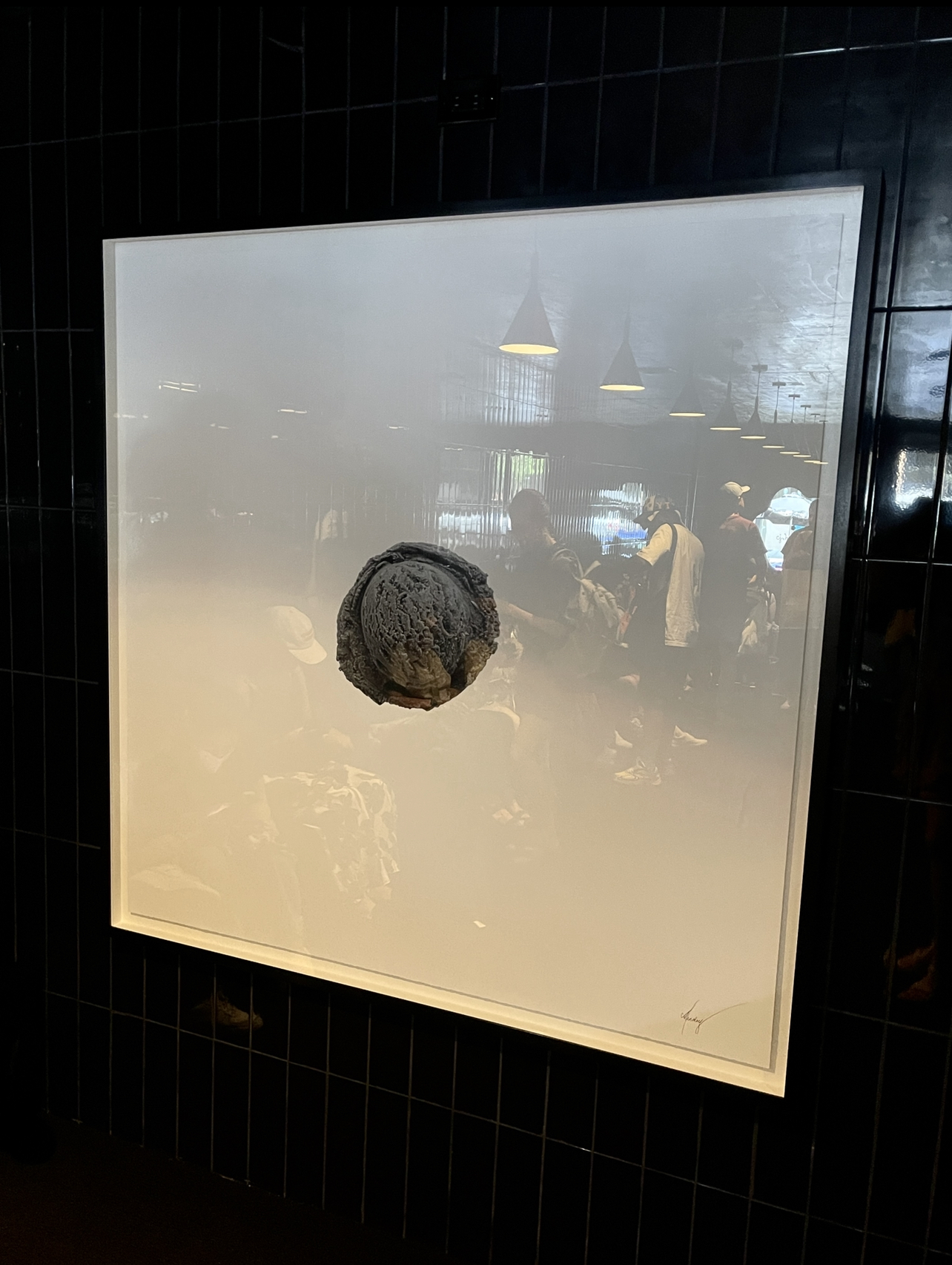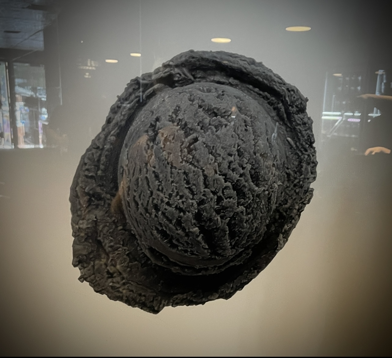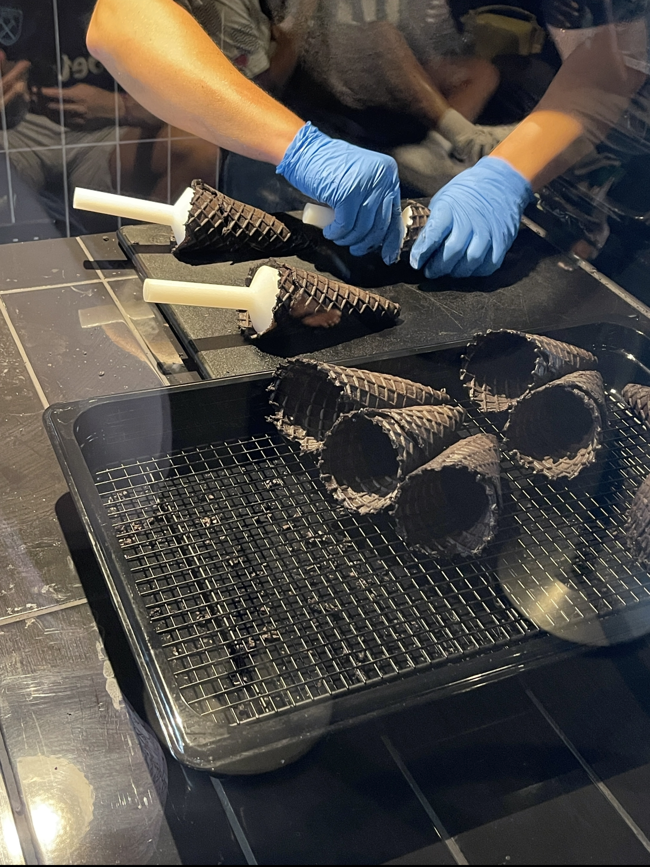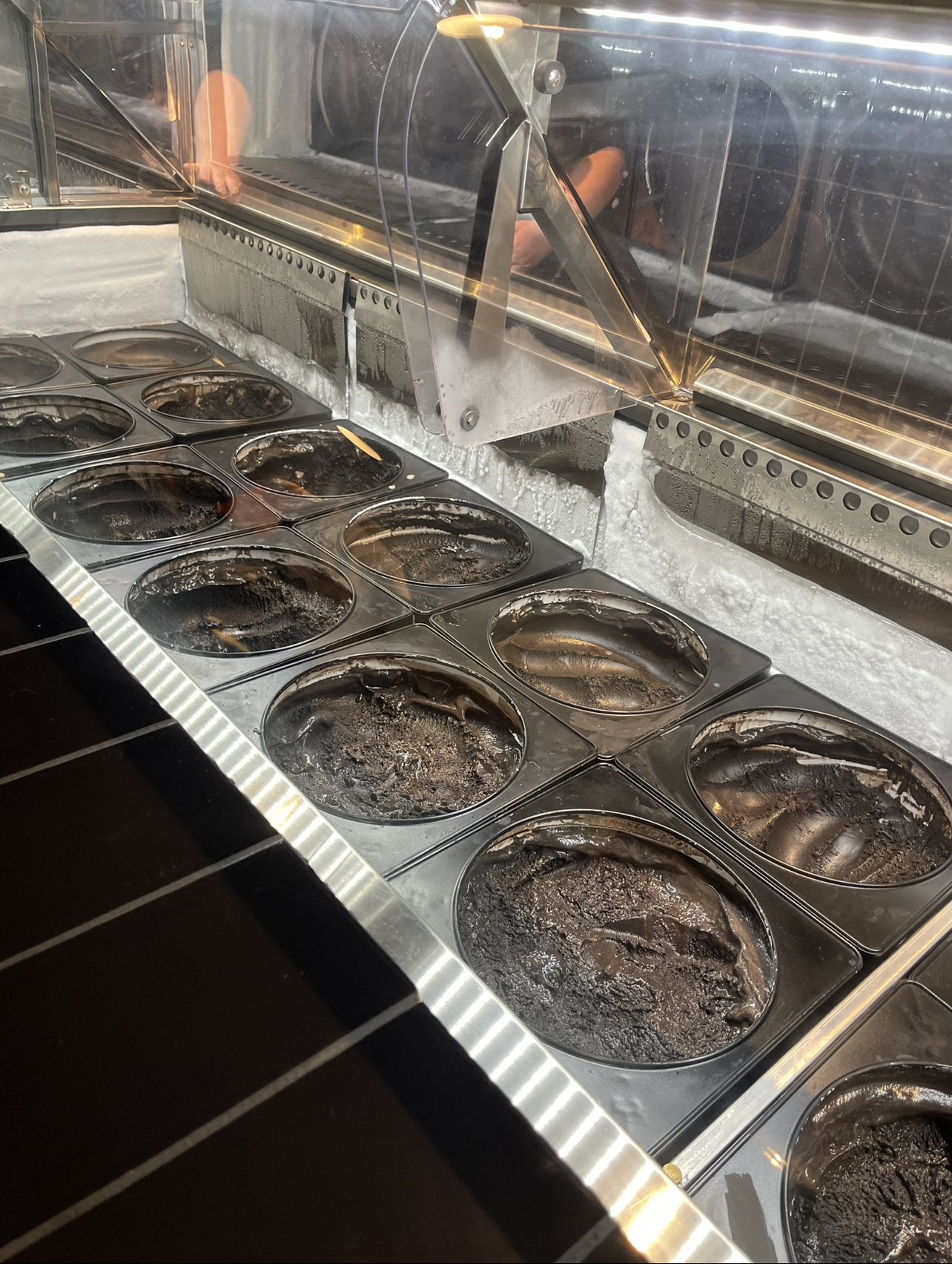Inside was all black from floor to ceiling. Custom cowhide seating lined the left wall and to the right were rows and rows of barrels of all black OPAQUE ice cream being scooped as well as someone hand making Black Buttercrisp waffle cones and bowls. At the very end of the room was the only piece of art; a x drawing of a single scoop of black ice cream which was not available for sale but was up for grabs. More on that in a bit…