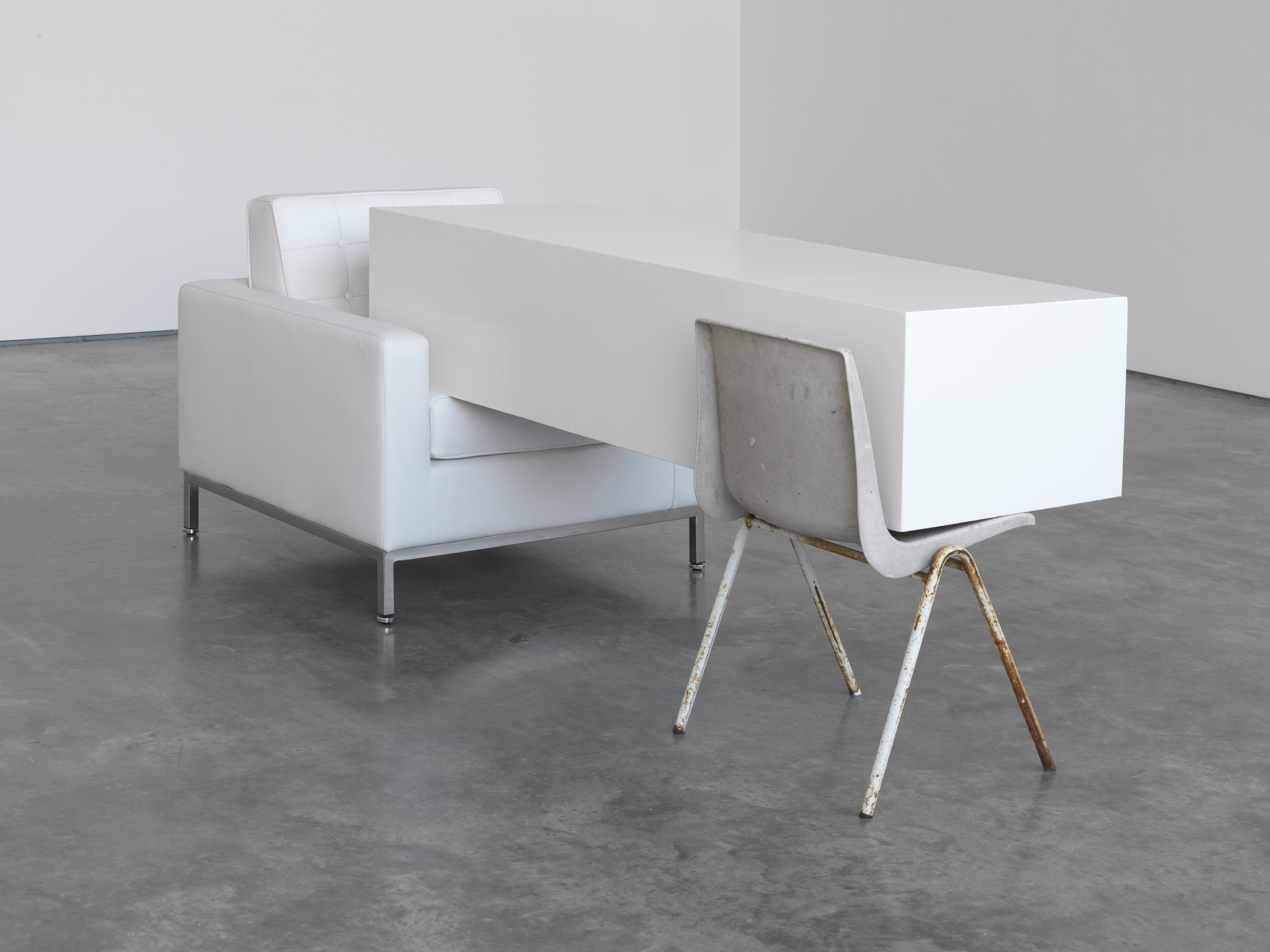 Angela de la Cruz, Transfer (White) with armchair (2011), Oil on wood, armchair with plastic chair, 80 x 180 x 84 cm, © Angela de la Cruz. Courtesy Lisson Gallery.