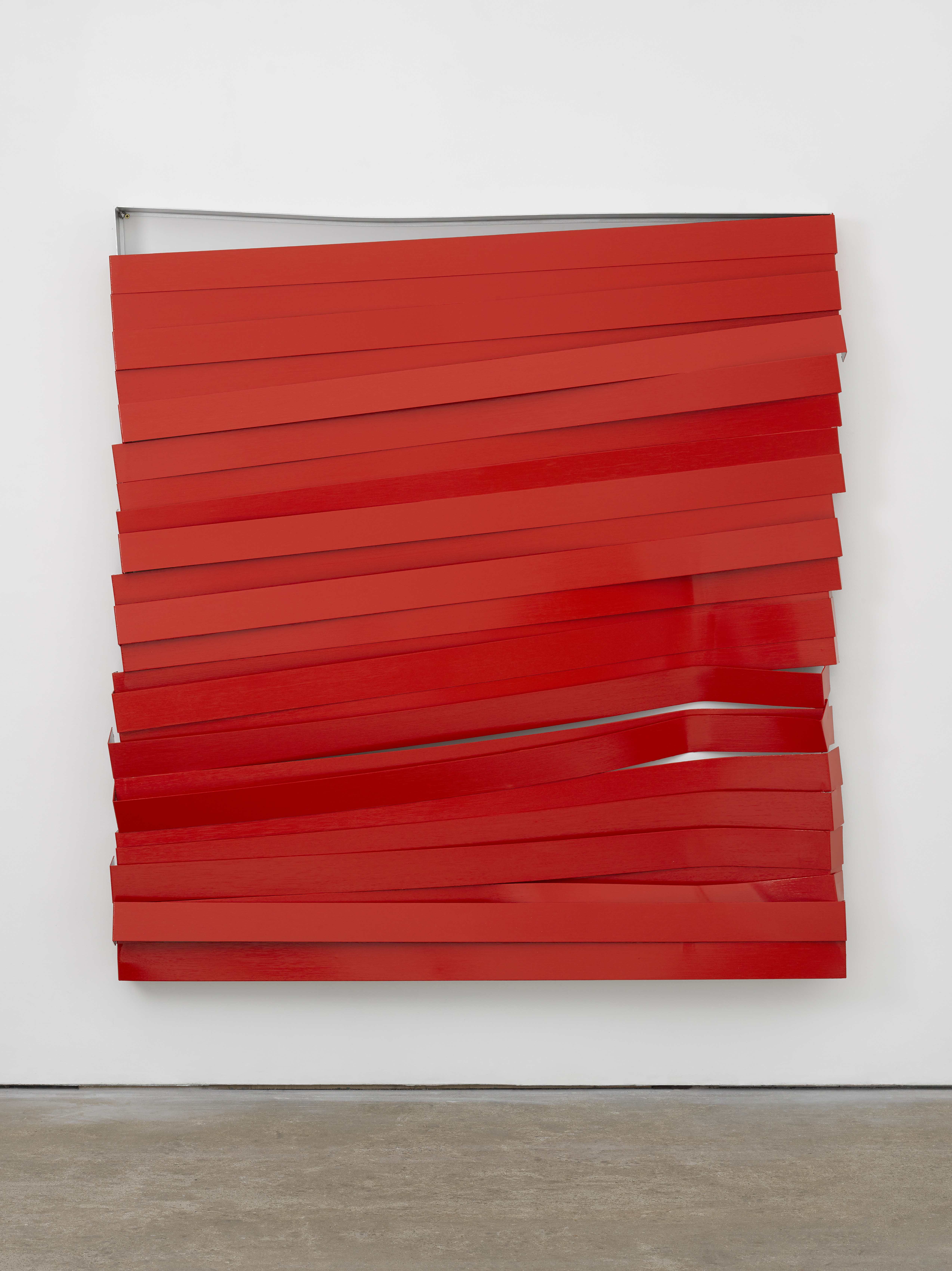 Angela de la Cruz, Shutter (Red) (2017), Oil and acrylic on aluminium, 154 x 162 x 16cm, © Angela de la Cruz. Courtesy Lisson Gallery. Photography by Jack Hems.