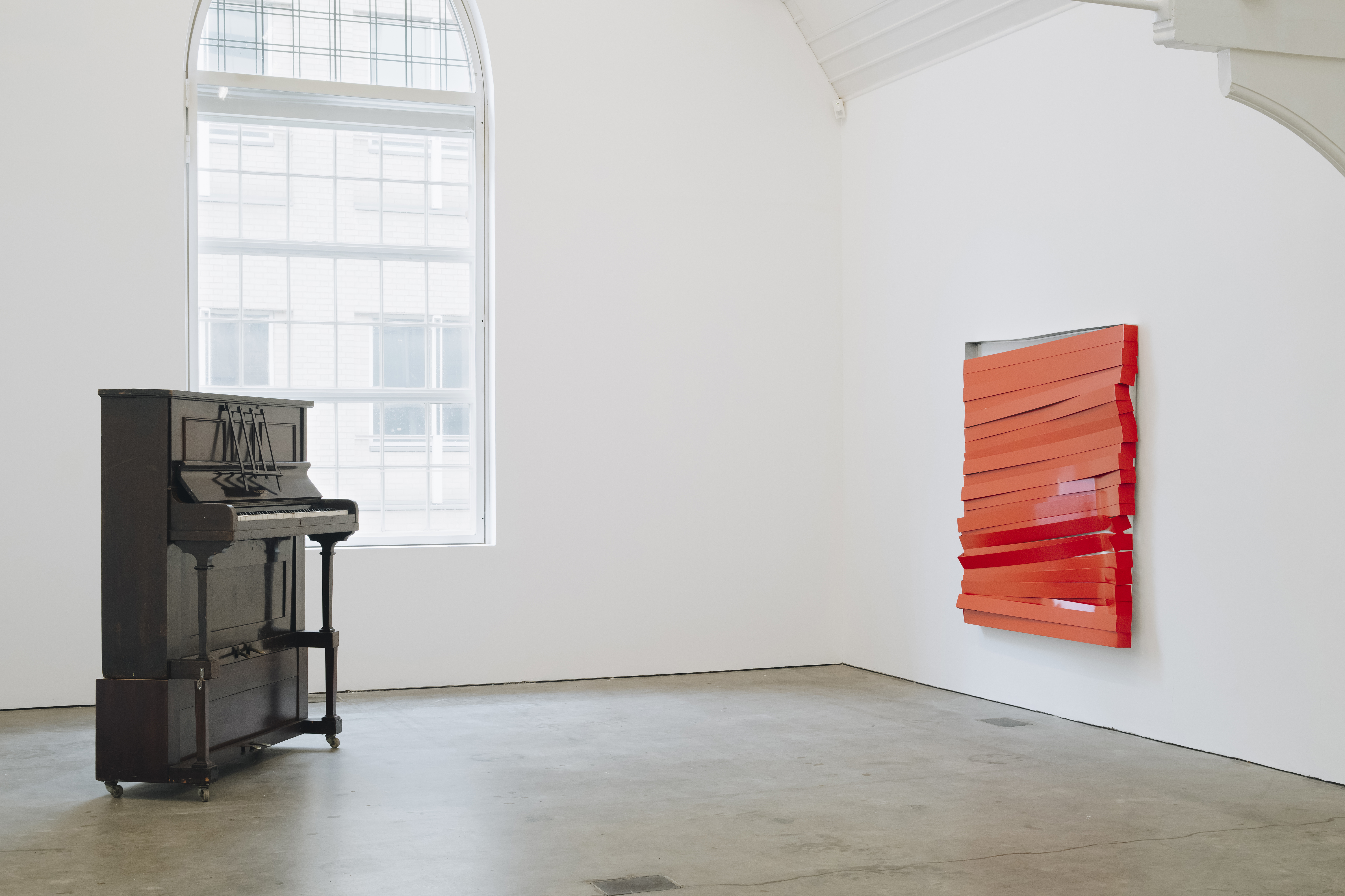 Musicality is a recurring theme throughout Angela de la Cruz’s body of work. In the late ‘80s, she moved to London, not for the visual arts, but for the music; obsessed with the likes of New Order, The Residents, The Fall, Big Audio Dynamite and The Clash. Upright Piano (1999), perhaps the most compelling piece on display, epitomises these two selves: the artist and the musicophile. While a student, de la Cruz began collecting old wardrobes and pianos from antique stores in East London. Joining and restringing together the bottom section of one piano to the top section of another, she Frankensteined an instrument playable at human height – or rather, the height of her friend and collaborator, Neill Quinton. Huddled around the Upright Piano, press day visitors witnessed its activation, almost 22 years after its creation. Inspired by the minimalist, musique concréte styles of Steve Reich and Phillip Glass, Quinton’s composition is fragmentary, fluid and unbound. He describes it as a “groove trying to get out”, marrying perfectly with de la Cruz’s structural ideology. Positioned alongside her latest work, Upright Piano is a resurrection from the past; a dialogue between the artist and herself. Just as her newest piece embraces dance, this work’s musicality reflects themes of adaptability and resilience that run throughout the exhibition. The freedom to dance and create music despite oppression remains a vital human expression. Angela de la Cruz’s ‘UPRIGHT’ is the radical call for performance, noise, strength, adaptation, and endurance – reminding us that through endurance, power emerges.
