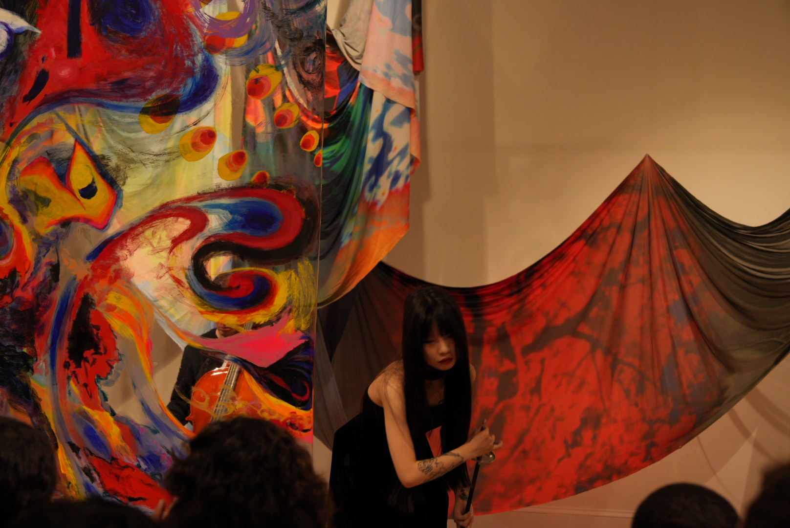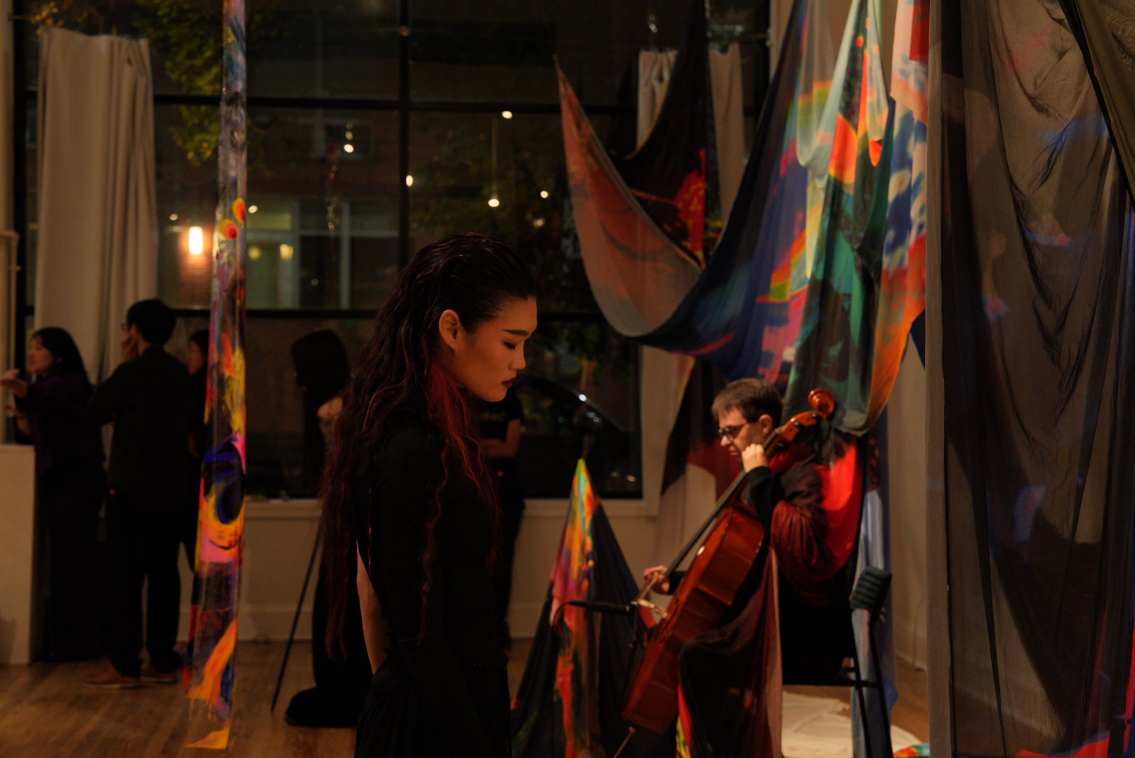 Artist Lucia Shuyu Li, Performer Ceci Sun, and Cellist Robert Karpay during performance “Résistance” at Making Space Baltimore, 2025. Photo courtesy of Qin Ai Xin.