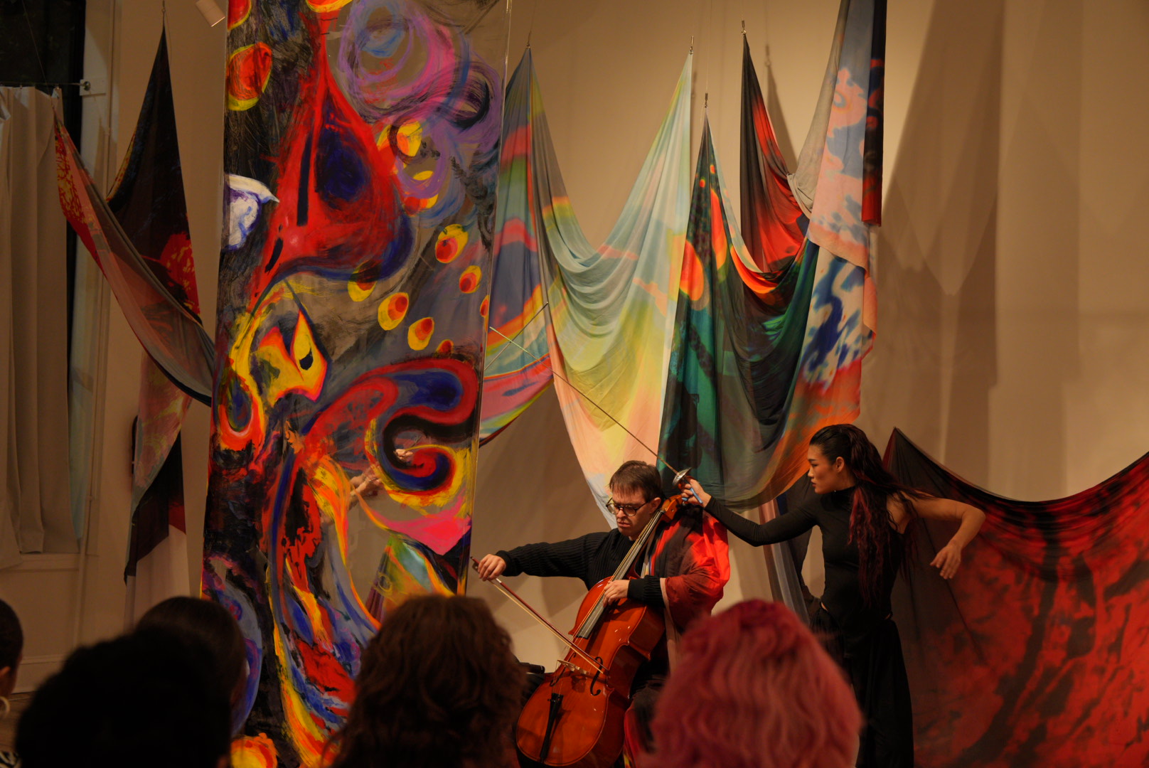 Artist Lucia Shuyu Li and Cellist Robert Karpay during performance “Résistance” at Making Space Baltimore, 2025. Photo courtesy of Qin Ai Xin.