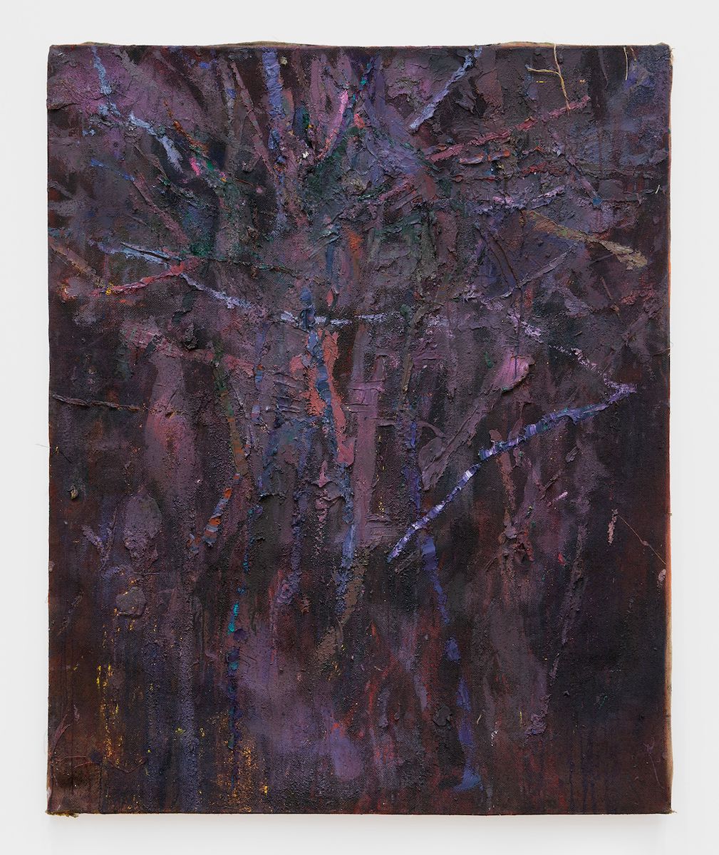 A glint of silver appears here and there, including in Purple Paper Pulp Painting (with afterpiece), 2026, a miasma of an overgrown bramble upon which a hovering embellishing brooch. Lewis’ embrace of the notion of the ‘puncture’, as coined by Roland Barthes, that proposes a piercing mark that anchors the chaotic activity beneath it is his motivation in seeking transcendence.