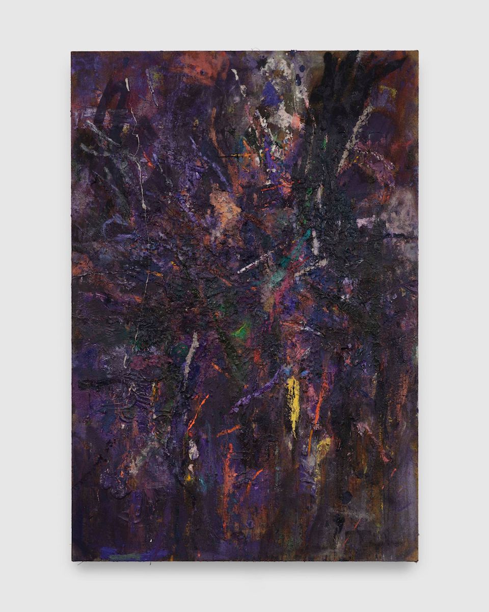 Spencer Lewis, Afterimage (purple self-immolation), 2026, oil, acrylic, paper pulp, ink on jute, 97 x 68 inches
