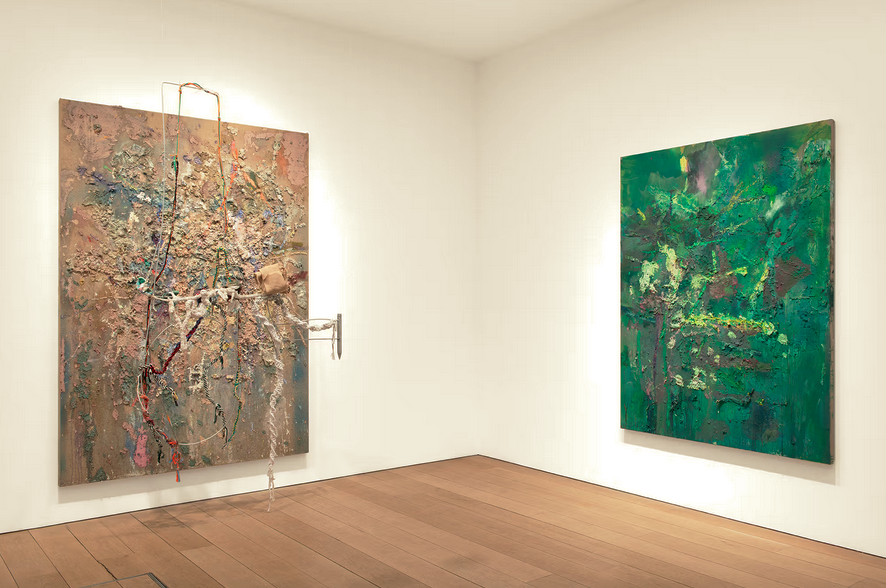 Installation view: Spencer Lewis: Aftterpiece showing (left) Brown Paper Pulp (afterimage bombed land, 2026, oil, acrylic, paper pulp, cotton cord, wire, cotton fabric, wood, steel and ink on jute, 96 x 68 inches, and (right) Green Paper pulp afterimage (with Mary Cassatt mother head), 2026, oil, acrylic, paper pulp, pigment and ink on linen, 78 x 60 inches