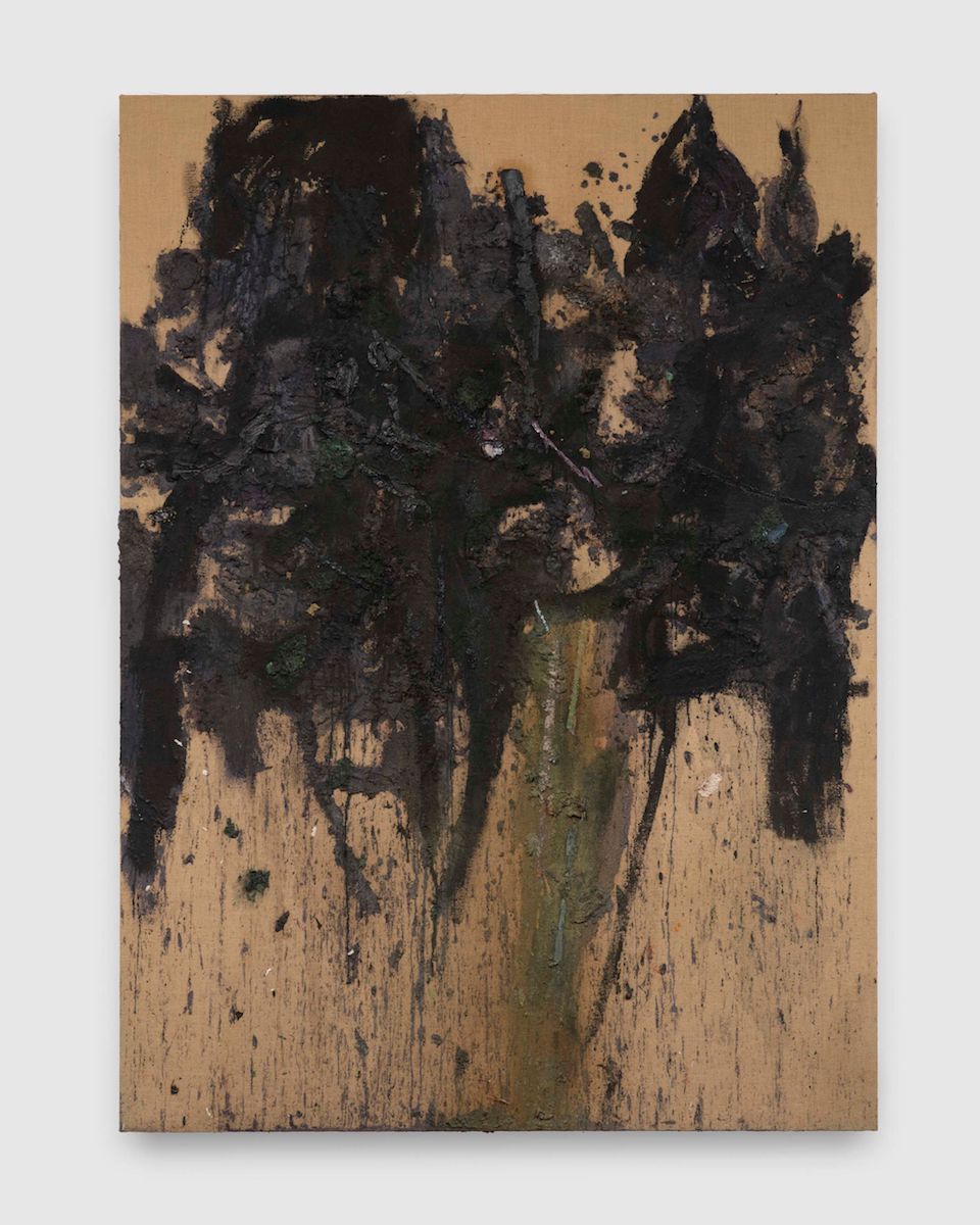 Spencer Lewis, Black Paper Pulp Painting (Immolated and exhumated), 2026, oil, acrylic, spray paint, enamel, paper pulp and ink on jute, 93 x 68 inches