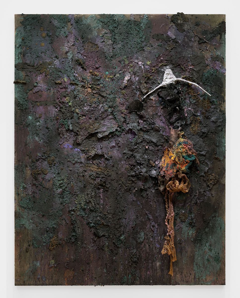 Spencer Lewis, Monolith (dateless gate proscenium for cosmic death), 2026, oil, acrylic, paper pulp, felt and ink on jute, 68 x 56 inches