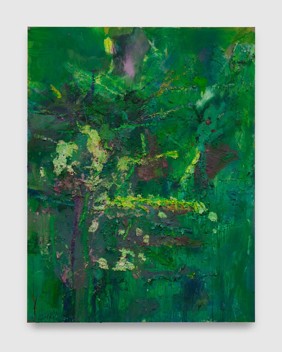 Forging into new terrain, as far as color goes, Lewis makes strides with green, from swampy to luminous, in Green Paper Pulp afterimage (with Mary Cassatt mother head), 2026, where the homage in encased in the title that guides the reverie.