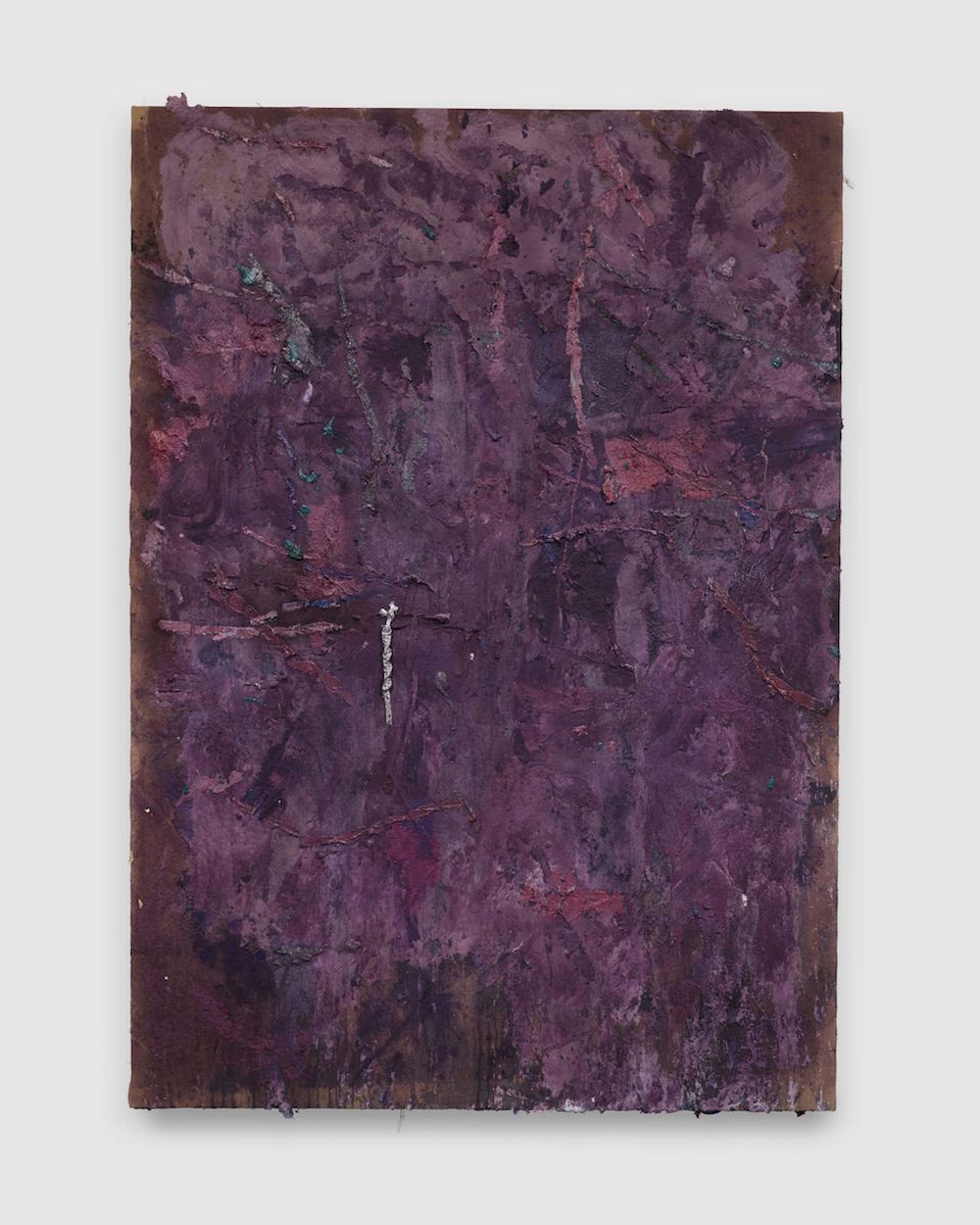 Spencer Lewis, Purple Paper Pulp Painting (with afterpiece), 2026, oil acrylic, paper pulp, aluminum and ink on jute, 96 x 68 inches