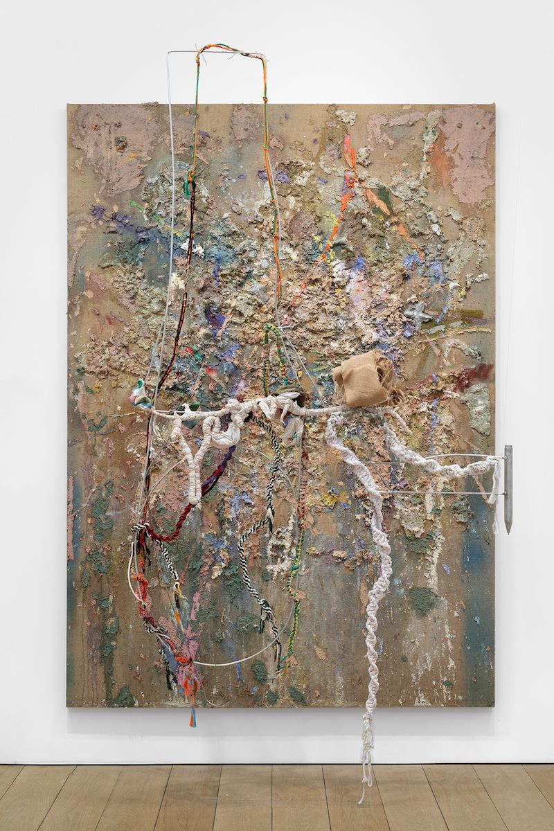 Spencer Lewis, Brown Paper Pulp (afterimage bombed land), 2026, oil, acrylic, paper pulp, cotton cord, wire, cotton fabric, wood, steel and ink on jute, 96 x 68 inches