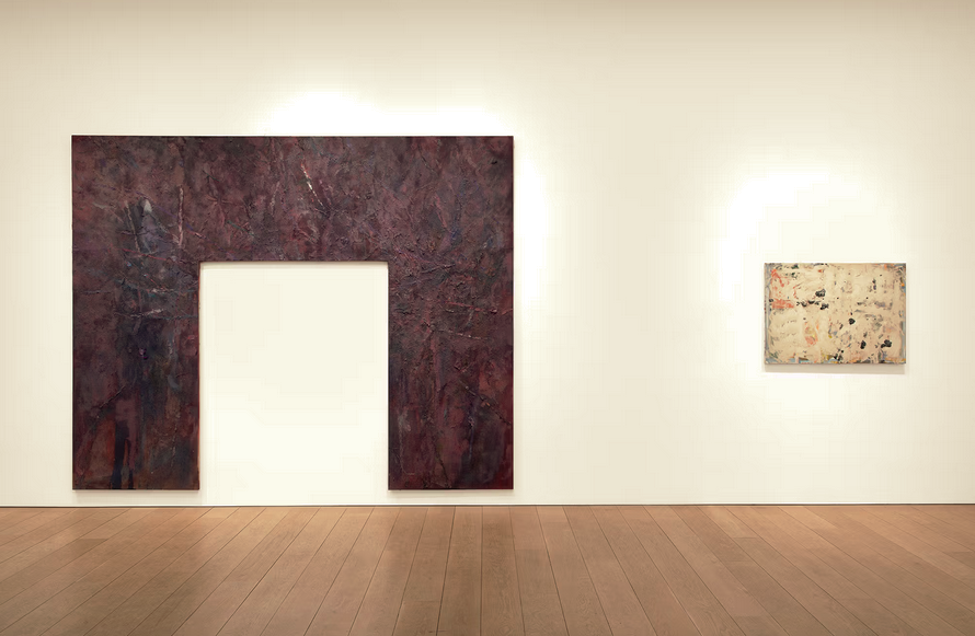 Installation view: Spencer Lewis: Aftterpiece showing (left) Monolith (dateless gate proscenium for cosmic death), 2026, oil, acrylic, paper pulp, spray paint and ink on jute, 105 x 130 1/2 inches, and (right) Wall (afterimage, 2025, oil, acrylic, paper pulp, spray paint and ink on linen, 30 x 42 inches
