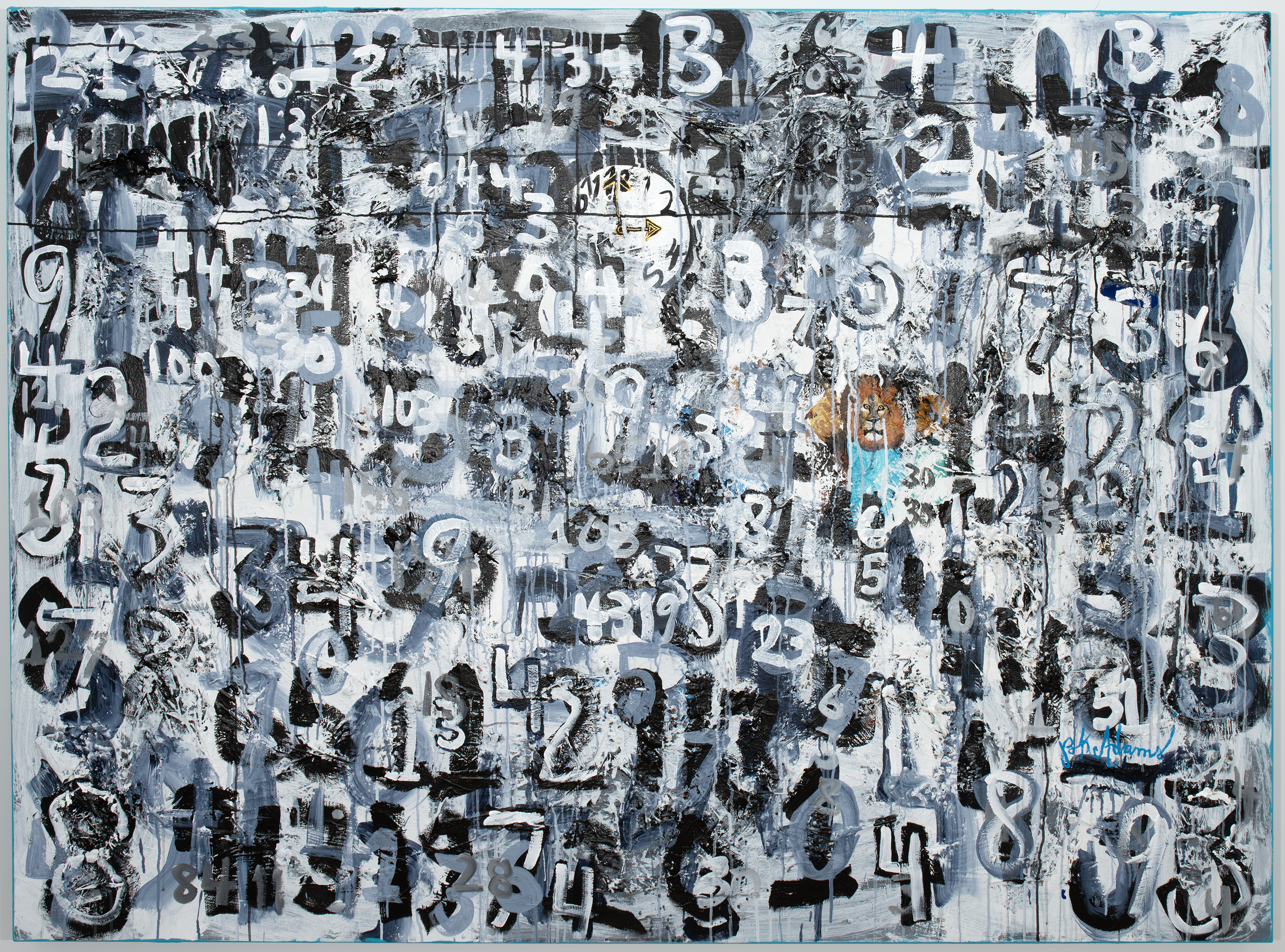 “Mystery” marks a return to the color of his earlier style, featuring the lion that inhabited much of his last show. The rest is lost in a forest of abstract, one might suspect mystical, numbers that vibrate and dance around him. “Sitting on Knowledge” featuring a colorful stack of books in the corner of a room crowned by a bright turquoise chair, is the other exception.