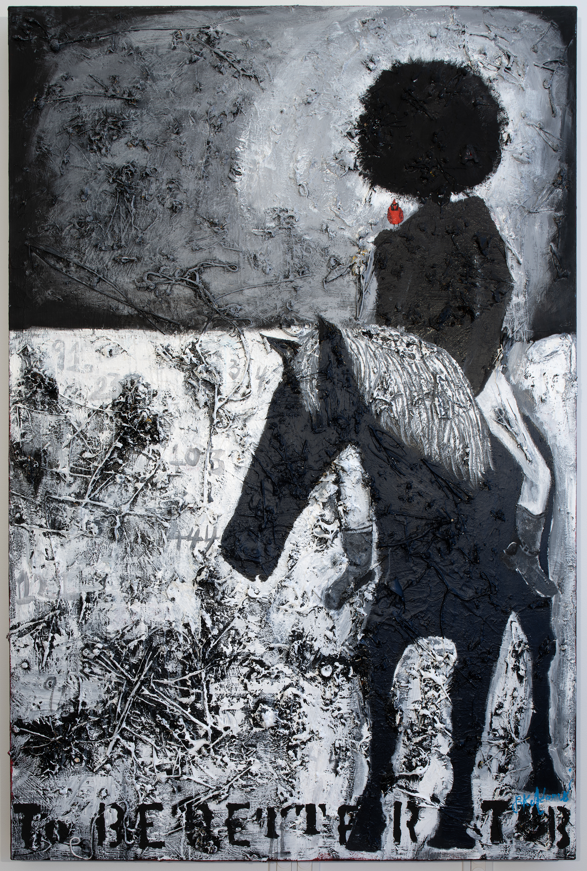 “Spirit “features the silhouette of a child astride a horse-a recurring character named ‘Judah’- riding through an abstracted landscape that is hashed out in off whites, charcoal and black. It recalls a figure from American Western mythology, or from a future post-apocalyptic dystopia. The only color is a scarlet bird sitting on the child’s shoulder, almost mistaken at first as a splash, perhaps even a drop of blood. Adams appears to be suggesting a ‘little bird’ of conscience, the painting supported by the chalky letters at the bottom: “To Be Better”.