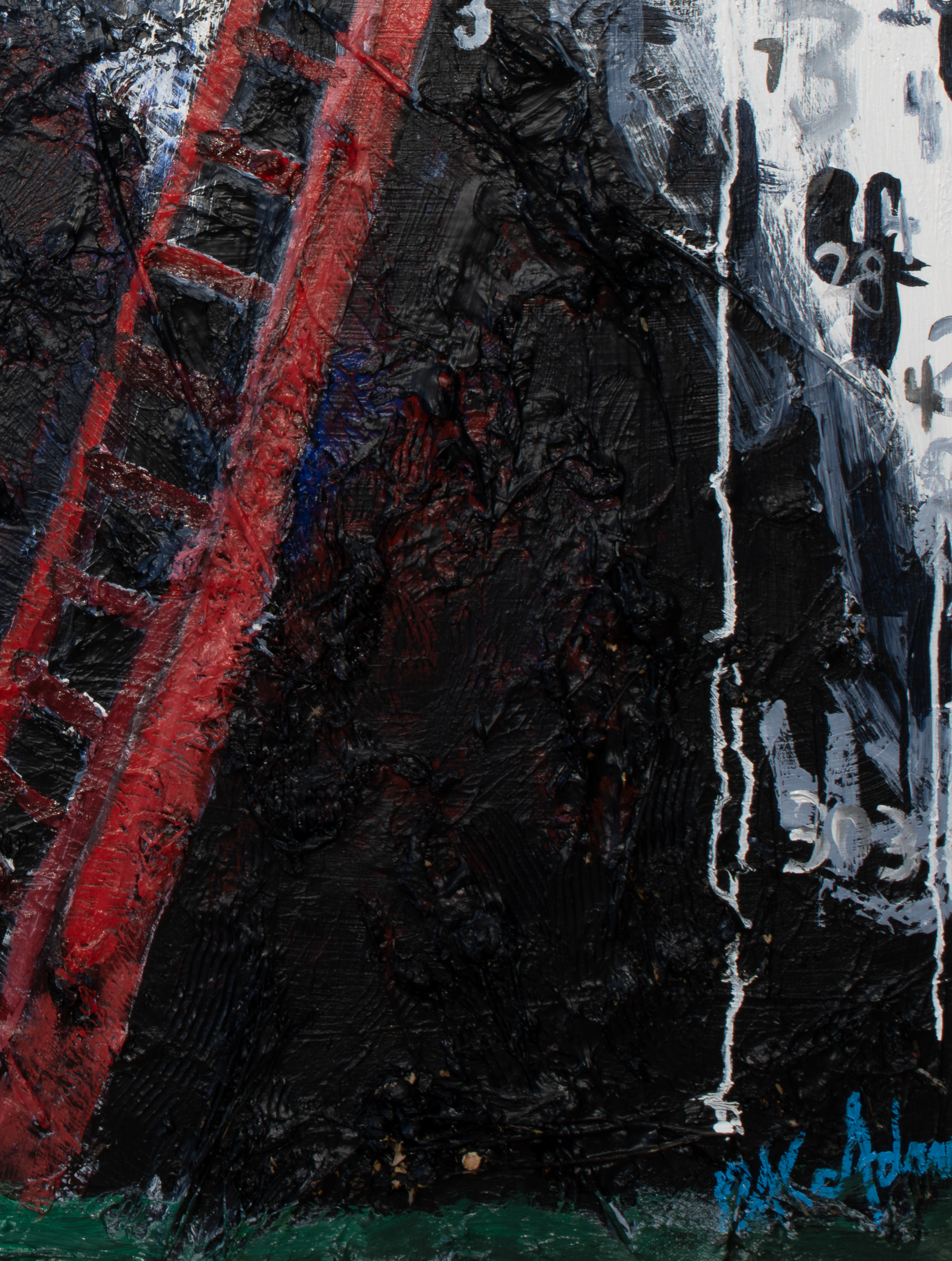 Bettering is a constant and cryptic reference in Adams work, as are the general themes of self, introspection, growth and community. “It’s Personal” appears to take the theme of self betterment as an endless assent, represented in this case as an endless red ladder ascending into a cloudy sky. The parable of Jacob’s ladder come to mind, with the as a metaphor for the vertiginous balance and narrow focus required for spiritual ascent.