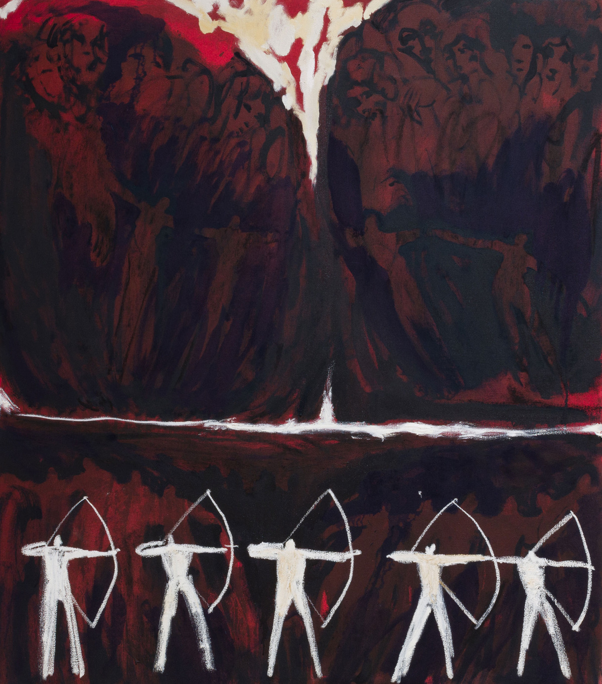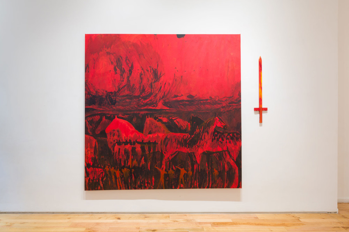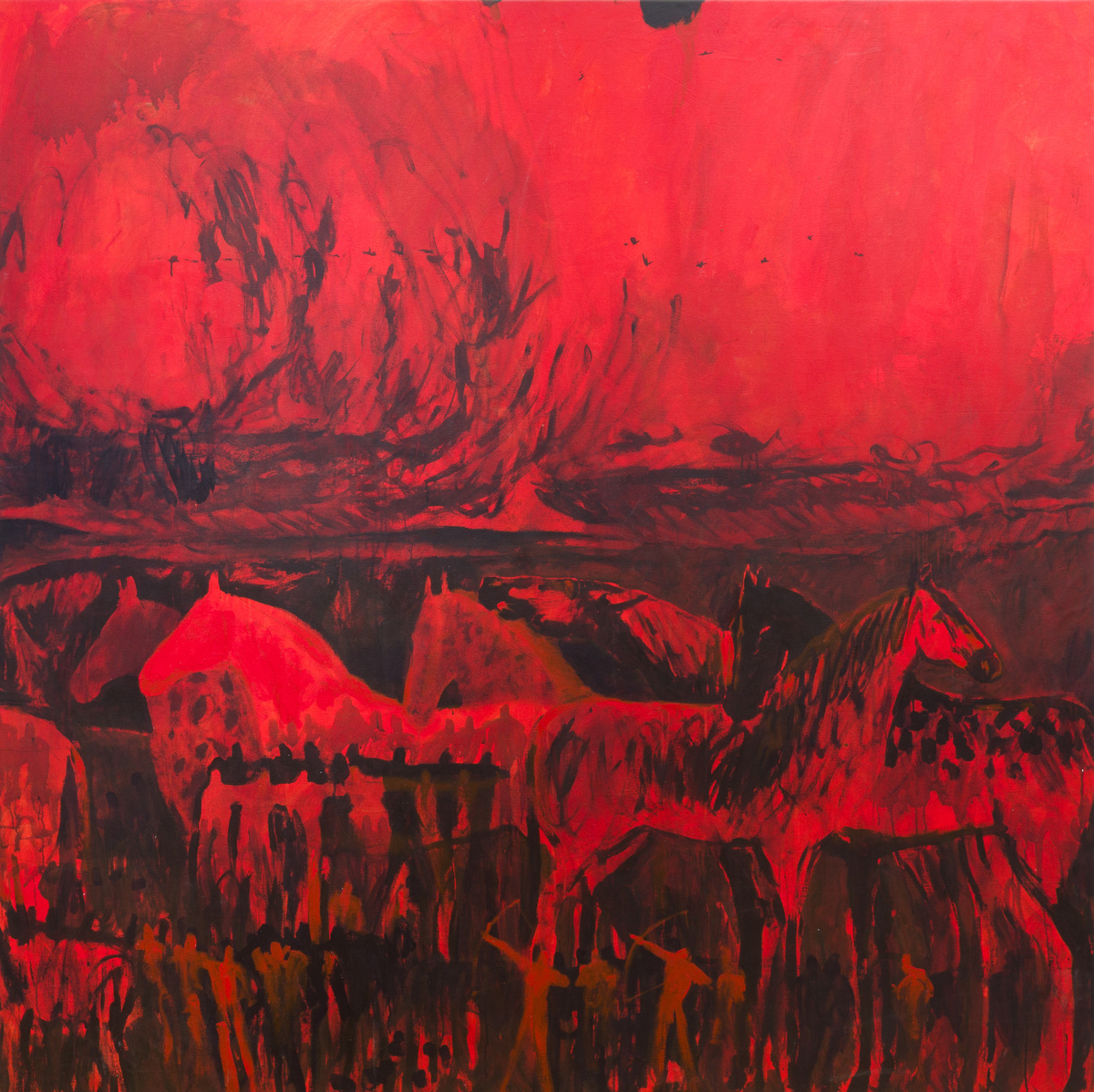 Animals are not the only subjects in these paintings, as people are given a similar treatment in other works. Mostly represented as monochromatic silhouettes, these semi-abstracted figures act in unison like their own non-animalistic herds. In one instance, they are divided up into elongated columns that recall angelic choirs of Northern Renaissance altarpiece panel paintings, while others seem to be driven by a Medieval Norman sensibility with flattened, repetitive figures caught in frenzied action. While writing this review, I showed a great painter friend of mine, Reuben Gordon, Winder-Lind’s paintings and he made an excellent observation about the abstracted people recalling American modernist Bob Thompson’s religious paintings of the 1960s (I also thought about Matisse, too).