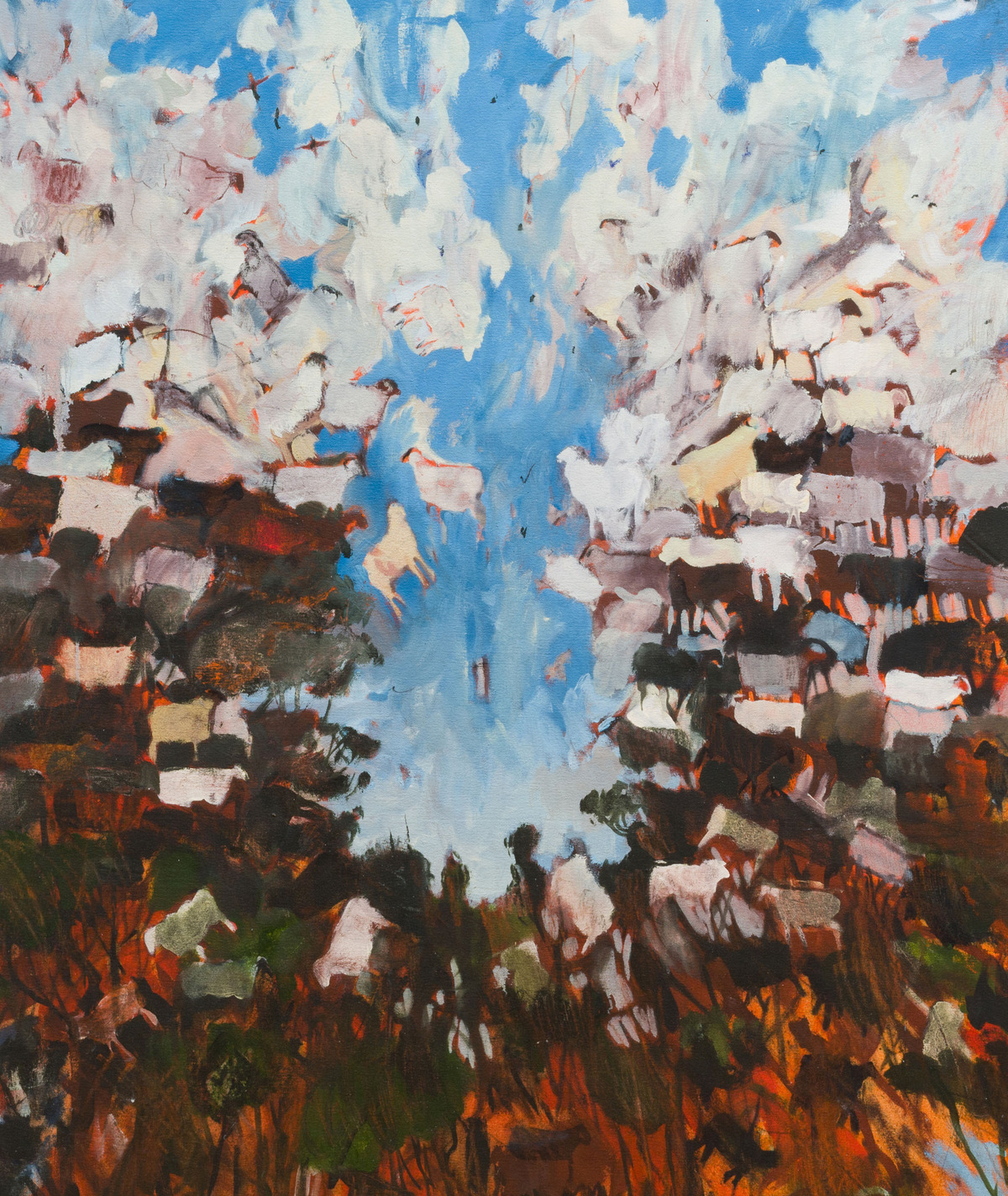 But it is so clear in Winder-Lind’s paintings these animals are not merely afterthoughts or pictorial stand-ins, for they are among his most important characters. Concurrent with the rising popularity of landscape painting in the 18th Century, the breeding and ownership of horses and sheep also became an important factor in social, political, and economic developments pre-Industrial Revolution. Horses were signs of wealth for the landed gentry and were prized for their ability to partake in competitive equine sporting. Meanwhile, sheep satisfied a plenitude of economic means as sources of material and dietary consumption. In Clouds of Limitless and Expanding Joy, these animals instead are afforded a heroic and heavenly status.