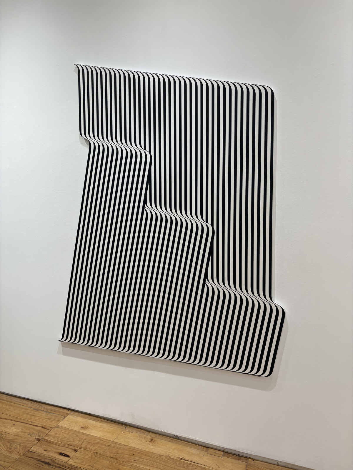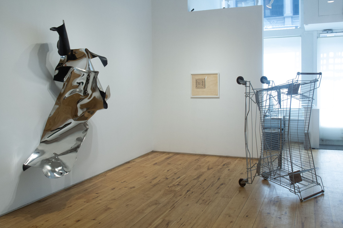 While abstraction is an overarching theme, Freight + Volume proves that this is not exclusionary as there are excellent examples for how Minimalism enters the figurative realm. Gronquist and Lionni both emphasize the thingness of found objects in a sculptural vein. Gronquist’s Civil War (2025) is a combination of two shopping carts whose caged bodies merge with one another in a collapsed backwards position. Like deer horns locked in combat, these carts seem to exhibit a moment of physical tension with one another. The two carts look piled up and nothing more, yet I can sense there is more than meets the eye because of the implied formal narrative given through Gronquist’s economical interventions in how much material he relies on to communicate its story. Lionni does something similar with Stack (2025), a white metal folding chair on top of another at an oblique angle. But hold on a minute, this is not any chair stack. Look closely and you will see that the legs of the topmost chair goes through the bottom chair. Are these two chairs or one? Lionni presents us with a formal dilemma in how we perceive the work because of this very minor, albeit significant technical choice.