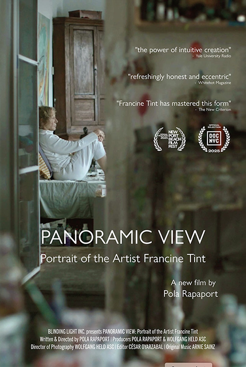 This realization anchors Pola Rapaport’s twenty-one-minute documentary Panoramic View – Portrait of the Artist Francine Tint shot by Emmy Award–winning cinematographer Wolfgang Held (The Andy Warhol Diaries). The film moves fluidly between Tint’s biography and the relentless studio practice that has sustained her for more than half a century. Tint reflects on this long arc with humor, candor, and a striking lack of sentimentality. “It was very, very sexist,” she says of the art world she entered in the 1960s. “I can toot my horn now, fifty-two years later—I was better than most of them. If I was ever in a group show, my work would shine. But I was kept down.”