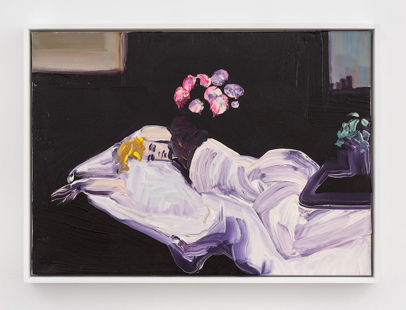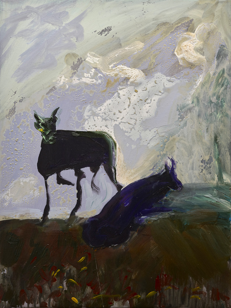 And her daughter, Alexandra, is woven into Hujar’s portrait of a pregnant nude friend, as Baez transposed her then-pregnant daughter’s face, from memory, onto the subject’s body, placing her expressively rendered figure within a broadly brushed, gestural field of purples and reds. The painting is displayed between two male nudes, a favorite subject in Hujar’s photography, with the canvas Daniel 1981, after Peter Hujar (2025), capturing the contorted subject sucking his toes. Baez portrays it with bold brushwork, revealing a fondness for Franz Kline’s calligraphic abstractions, while paintings of a dog in a grassy field and a still life featuring a high-heeled shoe round out the cleverly curated solo show.
