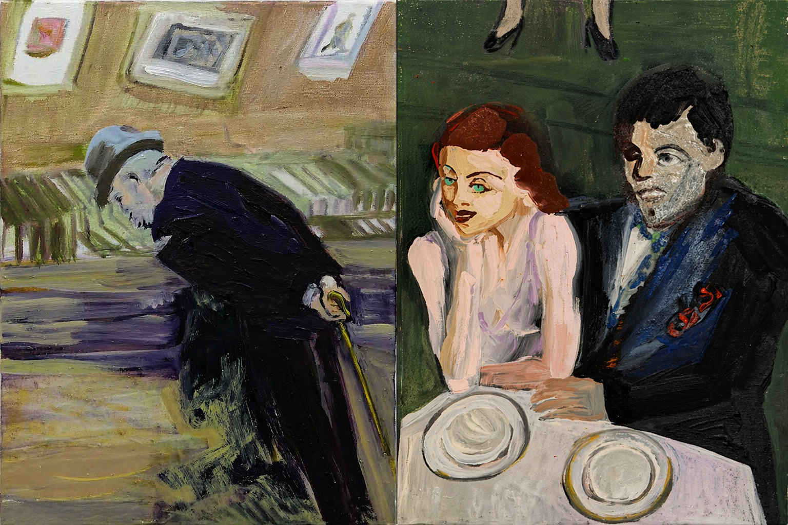 Her painting Brassaï, Paris - Prostitute playing billiards, Rue de Lappe, 1932 (2019) depicts a young, stylishly dressed woman with a flapper bob, strikingly posed at the edge of a pool table in a bar, while Brassaï, Paris - Professeur Louis Dianier, Membre of the Institute, on Quay Voltaire (2020) shows an elderly gentleman looking at books at a street stand along the Seine. The prostitute’s blouse becomes a lively abstraction, with vibrant, overlapping linear brushstrokes, while the professor’s black outfit blurs into his shadow and the ground, creating an expressive mix of brushwork and hues. And in the rapidly brushed Brassaï, Paris - Lesbian Couple at Le Monocle, 1932 (2020), a lesbian couple sits at a table in a famous Montparnasse nightclub, watching the dancing crowd with joy as they await their food.