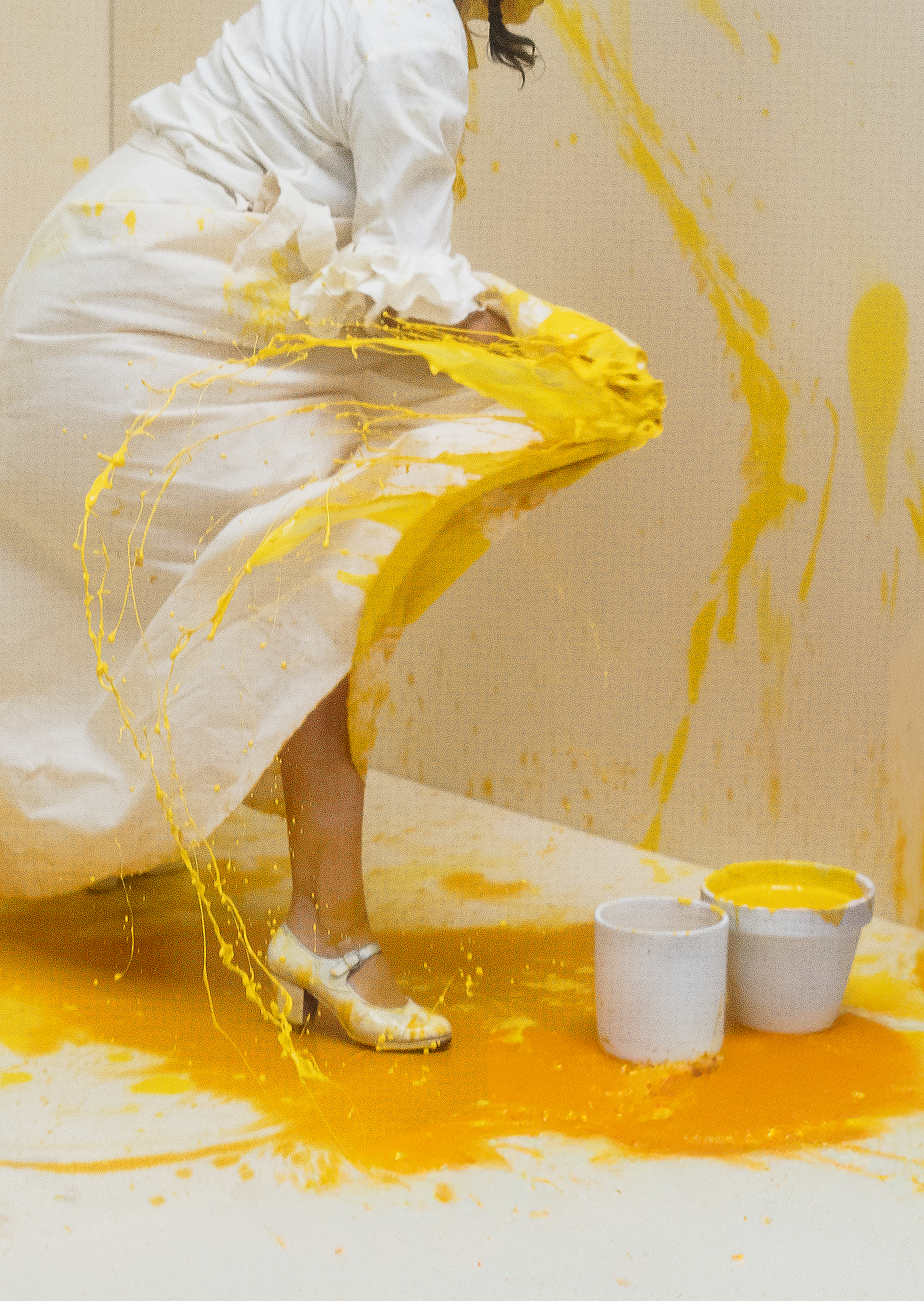The second phase shifts in tone and tempo. With the paint prepared and the canvases laid out, the studio becomes a stage. Dancers enter. Feet dipped in paint, limbs dragged across raw canvas. The work unfolds in real time, and the painting becomes an imprint of a performance.