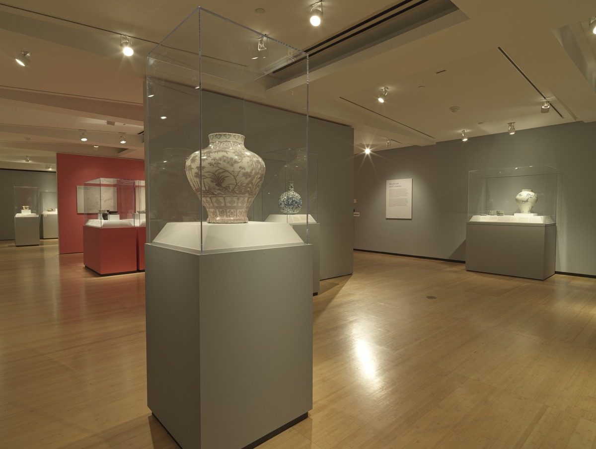 The ceramics and metalwork galleries shift from sacred image to object of use, but they do not leave these questions behind. A Joseon storage jar from Korea, painted in underglaze cobalt with pine, crane, and moon, first appears within the frame of elite Korean taste, then opens onto its later afterlife in Japanese tea culture. What was once a vessel of storage and domestic handling became an object of contemplative display in another ritualized system of looking. A monumental Yuan blue-and-white platter from Jingdezhen offers another version of this expanded biography. It can be admired as a triumph of Chinese ceramic design, but its Persian inscription and Mughal association prevent it from remaining simply local. Even a Ming sacrificial red dish, now almost abstract in its concentrated surface, once operated within a ceremonial and dynastic world that gave its color a specific charge.
