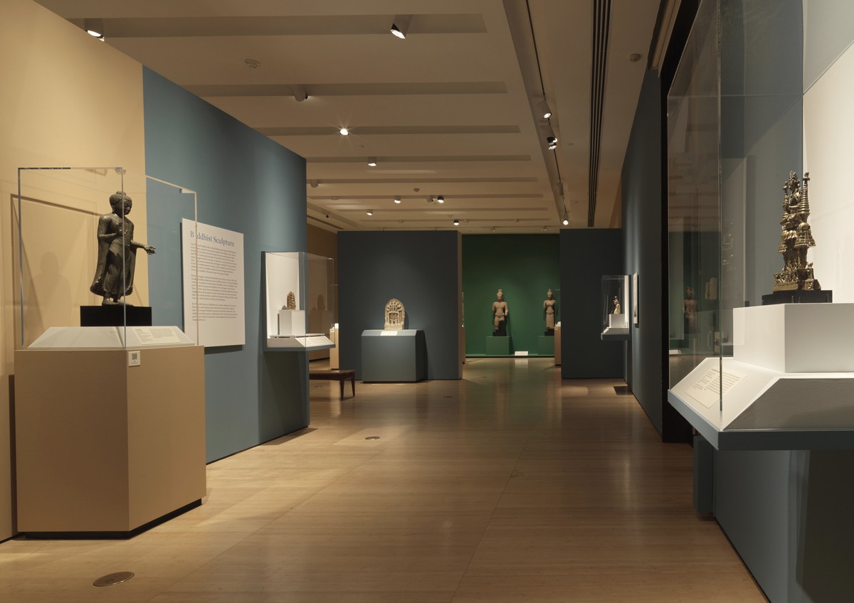 At first glance, Buddha and Shiva, Lotus and Dragon appears to offer the viewer a reassuring structure. On the second floor, Buddha and Shiva are distinguished within a single gallery, with the Buddha to the left and Shiva to the right; upstairs, vessels of metal and clay occupy a separate realm. That order is subtly reinforced by color. The blue walls surrounding the Buddha section lend it a quieter, contemplative air, while the deeper, brighter greens around Shiva give that side of the gallery a livelier charge. Buddhist sculpture, Hindu sculpture, and utilitarian objects are arranged into legible groupings, each with its own visual logic and historical frame. The exhibition is installed with admirable clarity. It does not overwhelm.