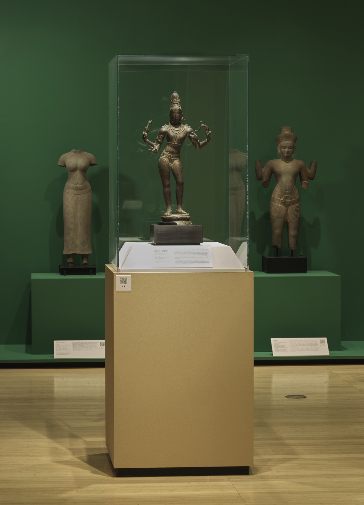 A Cambodian Shiva pushes the matter further. The work is presented as a Hindu image, yet its surviving features suggest that it may originally have been Buddhist before later adaptation for Shaivite use. It matters not because it confirms a category, but because it unsettles one. Nearby Khmer figures identified only provisionally as male and female have a similar effect. Their uncertain status—royal, divine, or somehow both—suggests that the most interesting works in the exhibition are often those least content to remain where the labels place them. The show organizes with confidence; the objects themselves often remember layered histories.