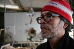 The studio Jaybo (who also goes by Monk) has been working at for the last few years is a former carpentry workshop just around the corner from the Südstern cathedral, a long brick building nestled in a hinterhof (the back courtyard spaces which the backsides of Berlin's honeycomb of apartment buildings often share). With thick glasses, a red beanie and several days' worth of gray/black scruff on his face he comes across as easygoing and even a bit distinguished yet also energized with a constantly running train of thought teeming with stories and ideas as he talks.